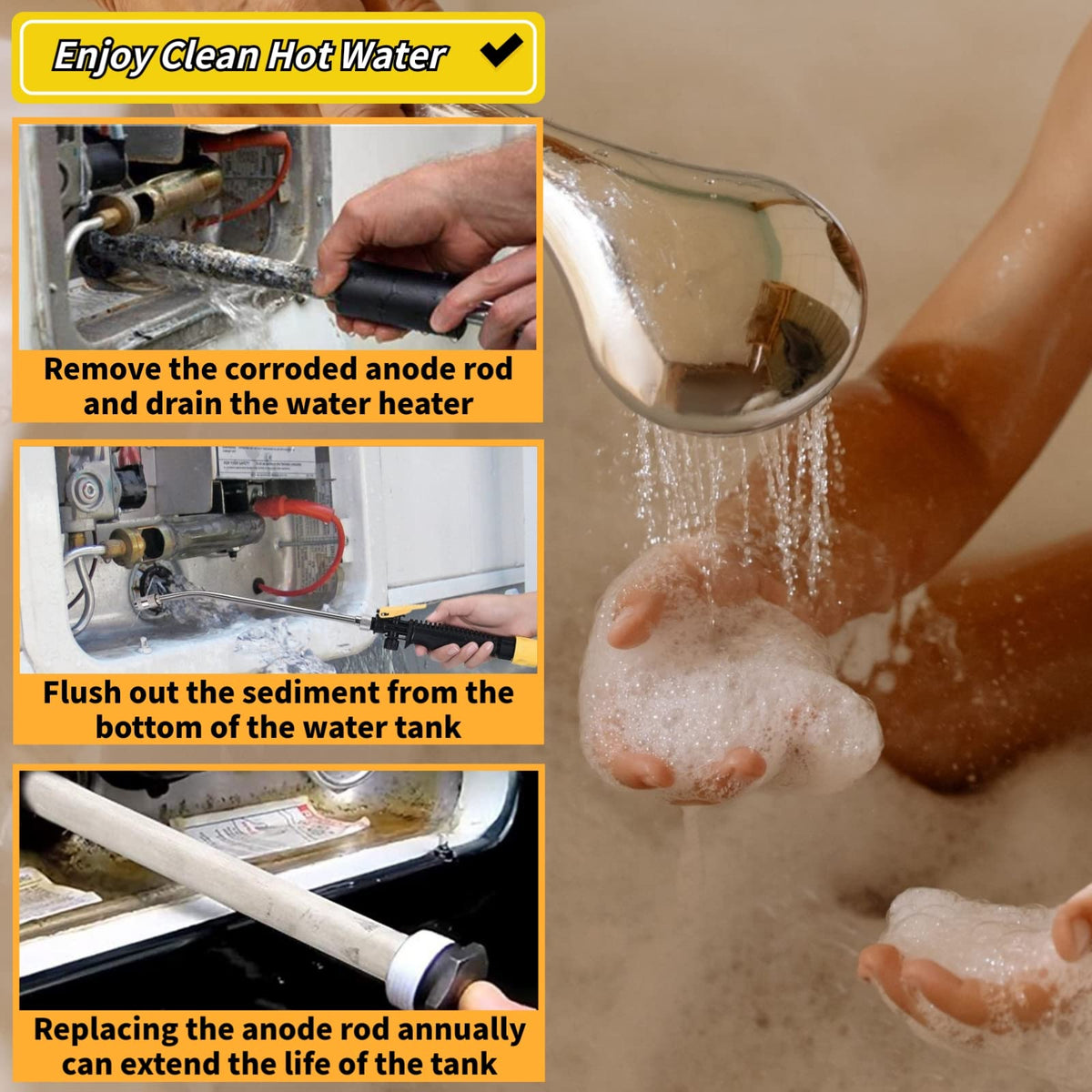 Q: How does the flush wand improve RV water heater maintenance?A: The innovative design of the flush wand allows for powerful forward spraying and 360-degree rotation, enabling thorough cleaning of the water heater tank to remove sediment and ensure efficient operation.