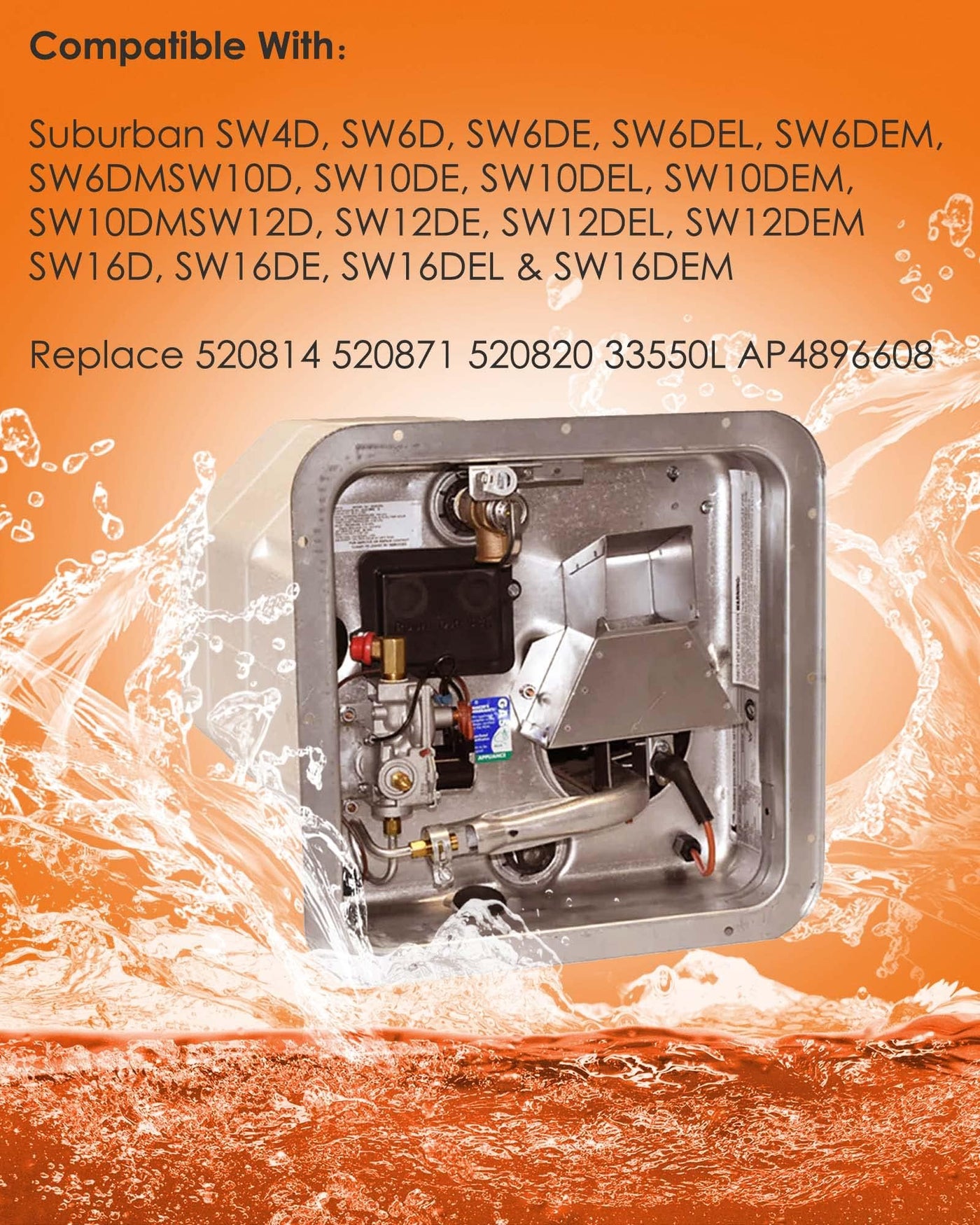 520814 Module Boards Compatible Models: Compatible with Suburban SW4D SW6D, SW6DE, SW6DEL, SW6DEM, SW6DM SW10D, SW10DE, SW10DEL, SW10DEM, SW10DM SW12D, SW12DE, SW12DEL, SW12DEM SW16D, SW16DE, SW16DEL & SW16DEM Replace 520814 520871 520820 33550L AP4896608 If your module board malfunctions: The water heater control board is typically used to control the operation and temperature adjustment of the heater If the board fails, it may result in the heater not working properly or being unable to provide an adequate supply of hot water This can affect the showering experience in your RV, as you may not be able to obtain the desired temperature or a continuous supply of hot water If the RV's hot water heater is integrated with the stove or cooking equipment, the heater is needed to provide hot water for cooking A control board malfunction may result in the inability to obtain the required hot water supply, thus affecting cooking and culinary activities, as well as overall comfort and user experience Note: It is advisable to promptly seek repairs or replacement This ensures that the hot water heater system can operate properly and provide a stable and suitable supply of hot water