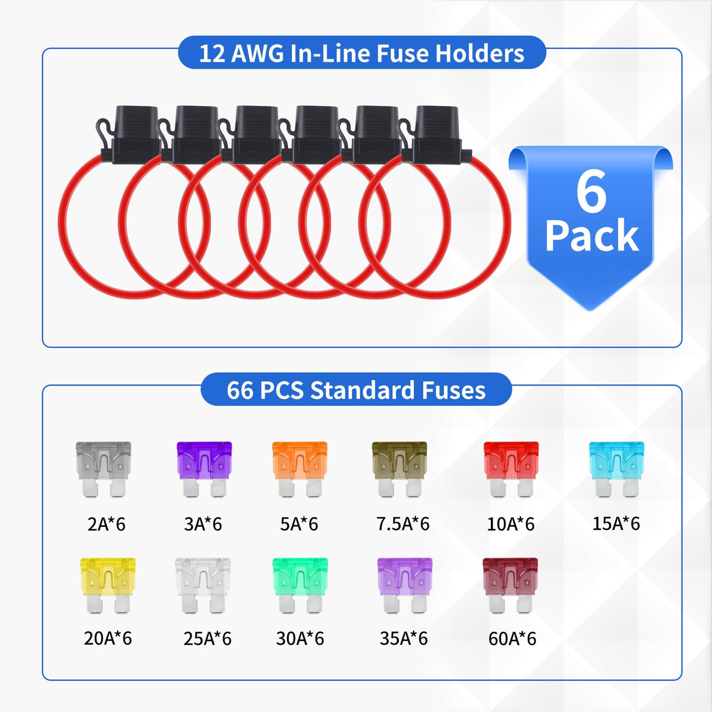 6 Pack Inline Fuse Holder 12V, Upgraded 12 AWG Waterproof Fuse Holder with 66 Pcs Standard Car Fuses (2A/3A/5A/7.5A/10A/15A/20A/