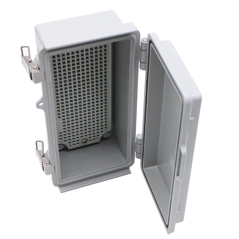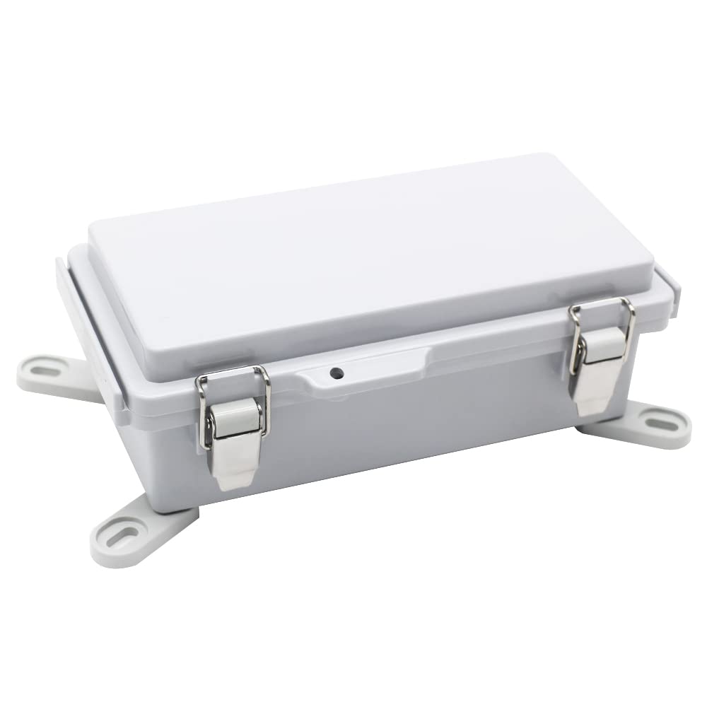 Q: What materials are used in the construction of this junction box?A: This junction box is made from high-quality ABS material for durability and impact resistance, along with stainless steel latches for added strength and rust resistance.