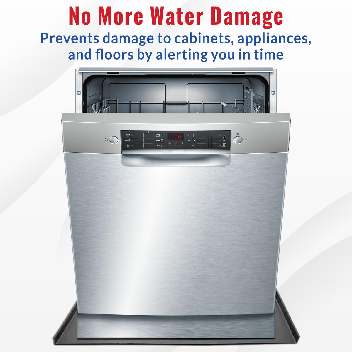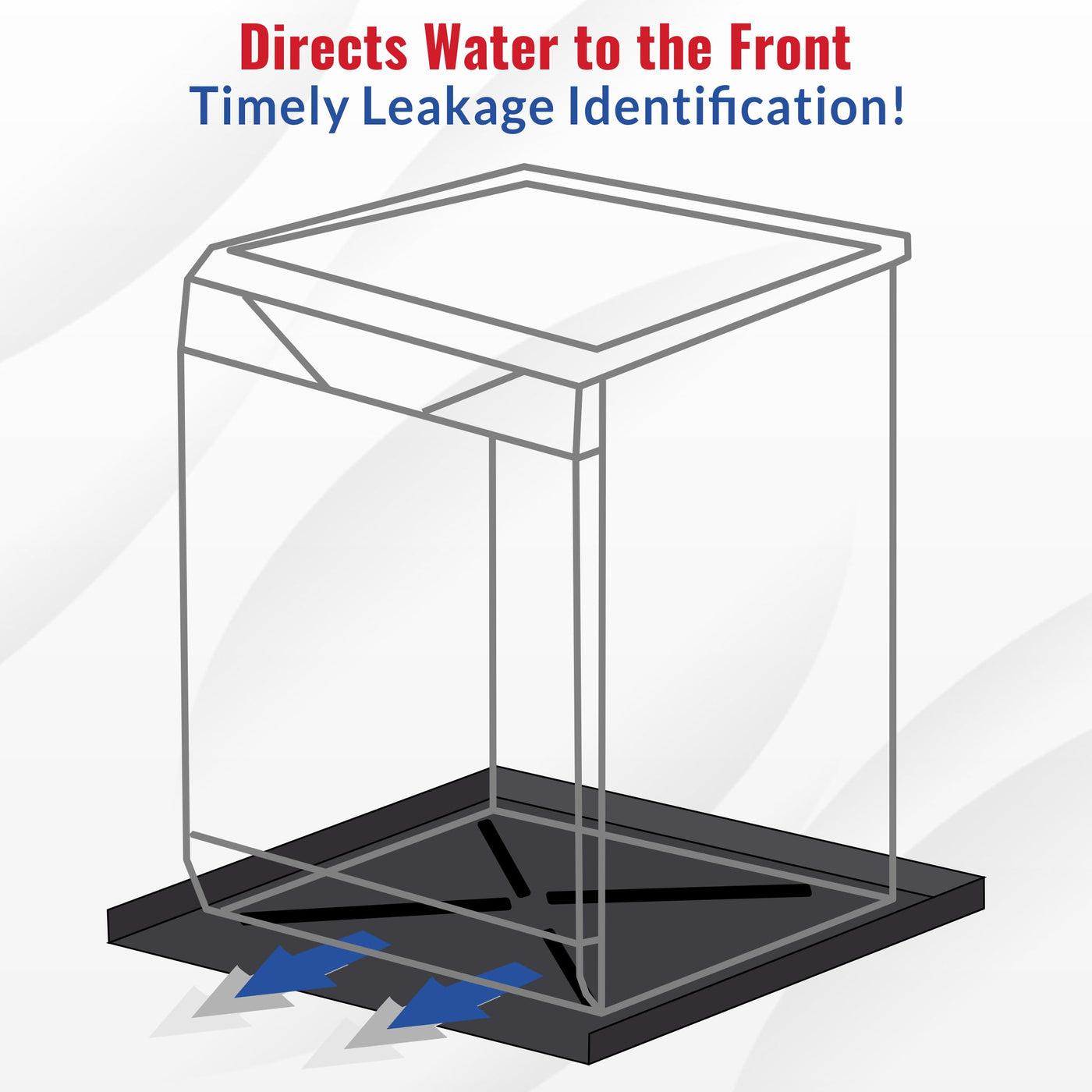 Q: How does the American Built Pro Dishwasher Drain Pan help prevent water damage?A: This drain pan directs leaks to the front of the dishwasher for timely identification, helping to protect your floors and cabinets from potential water damage due to leaks or hose failures.