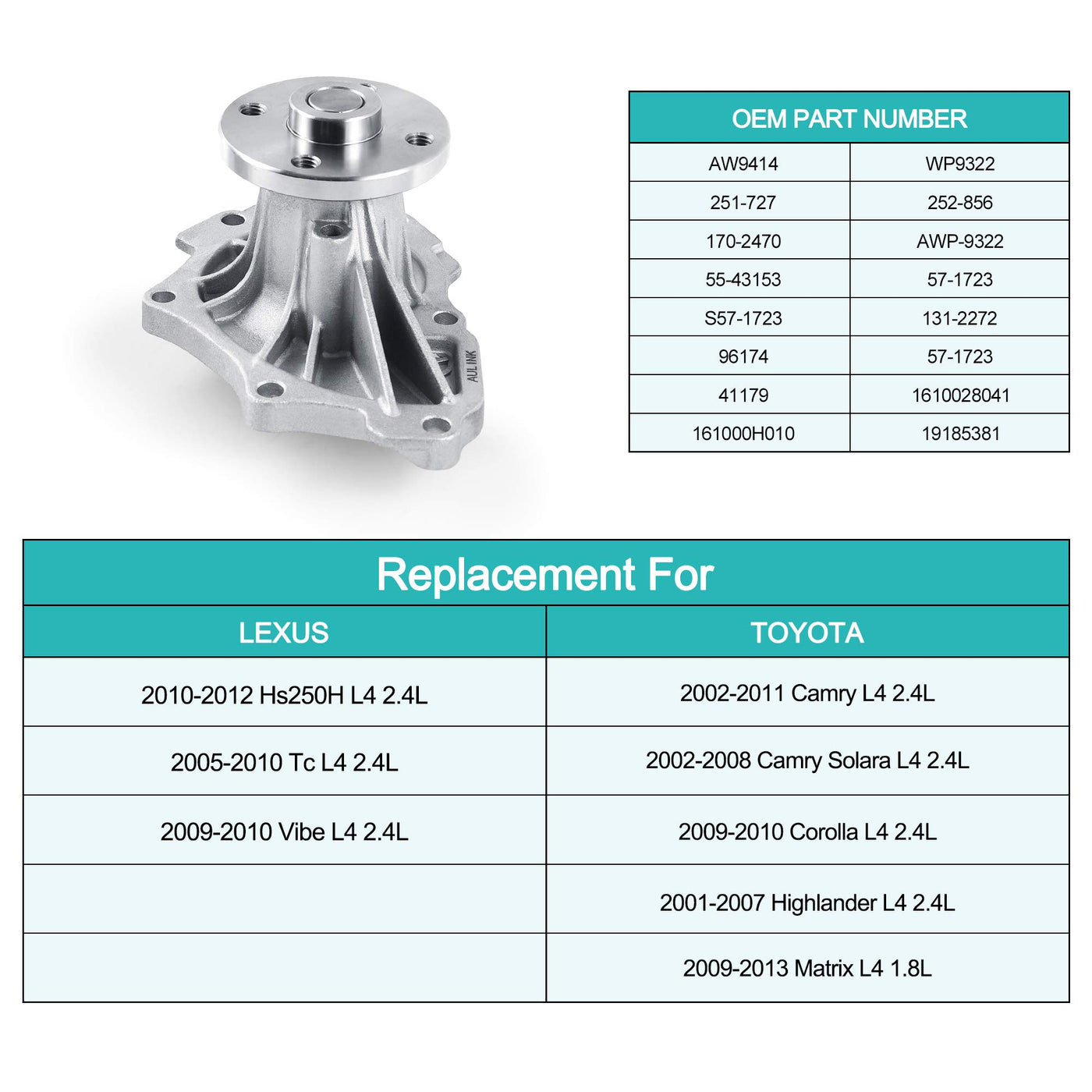 Aulink Aw9414 Water Pump Kit For Toyota Camry Corolla Highlander Matrix Rav4 Solara, Lexus Hs250H, Pontiac Vibe, Scion Tc Xb, 2.0L 2.4L L4 Engine