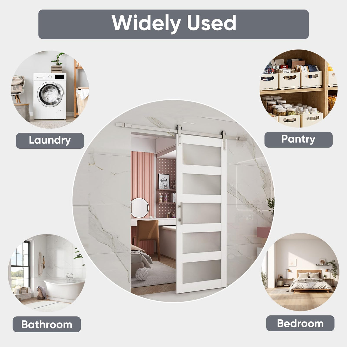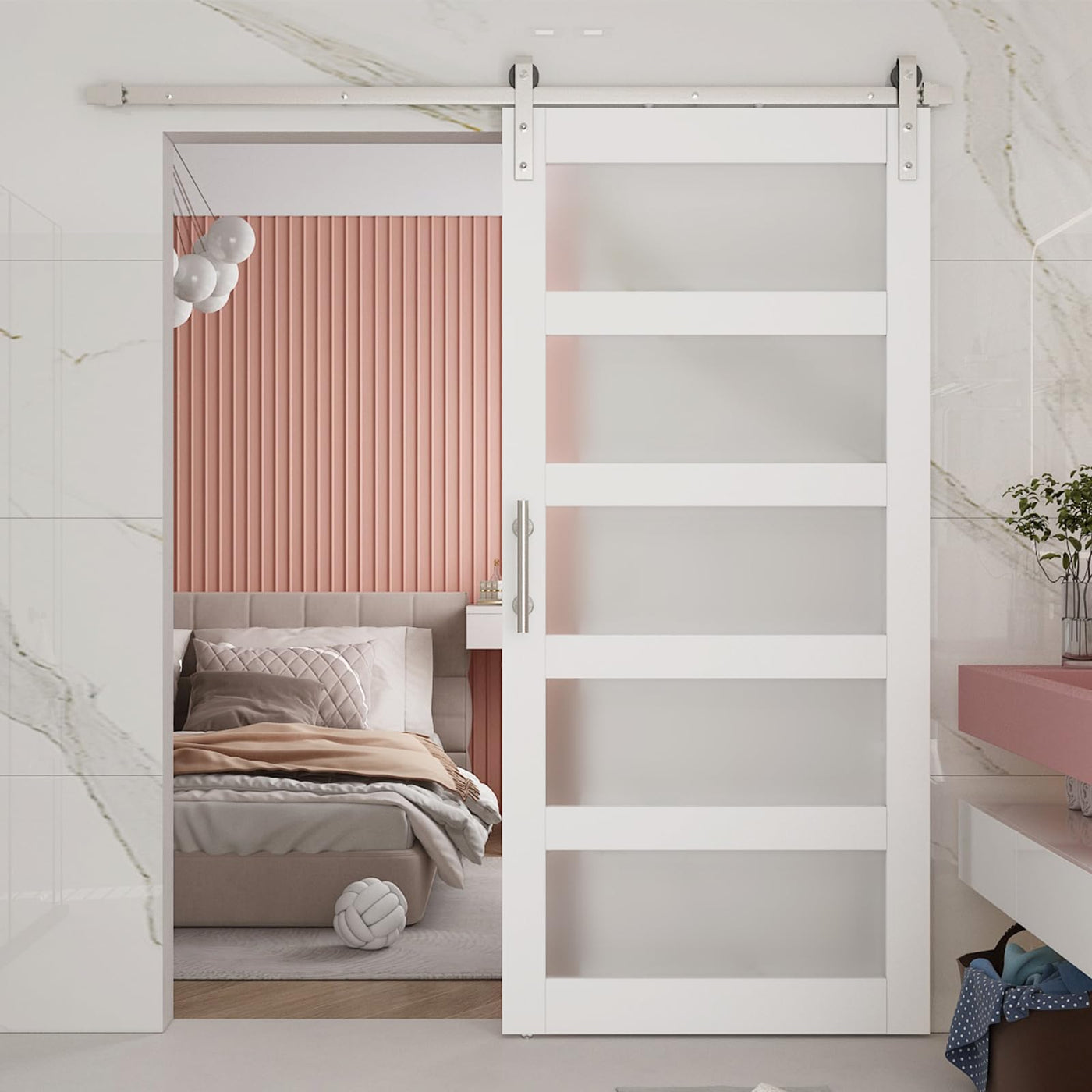 Barnsmith 36In X 80In Glass Barn Door With 6.6Ft Brushed Nickle Sliding Door Hardware Included & Handle,5-Panel Frosted Glass Solid Wood Water-Proof Pvc Surface,Pre-Drilled Easy Assembly,White