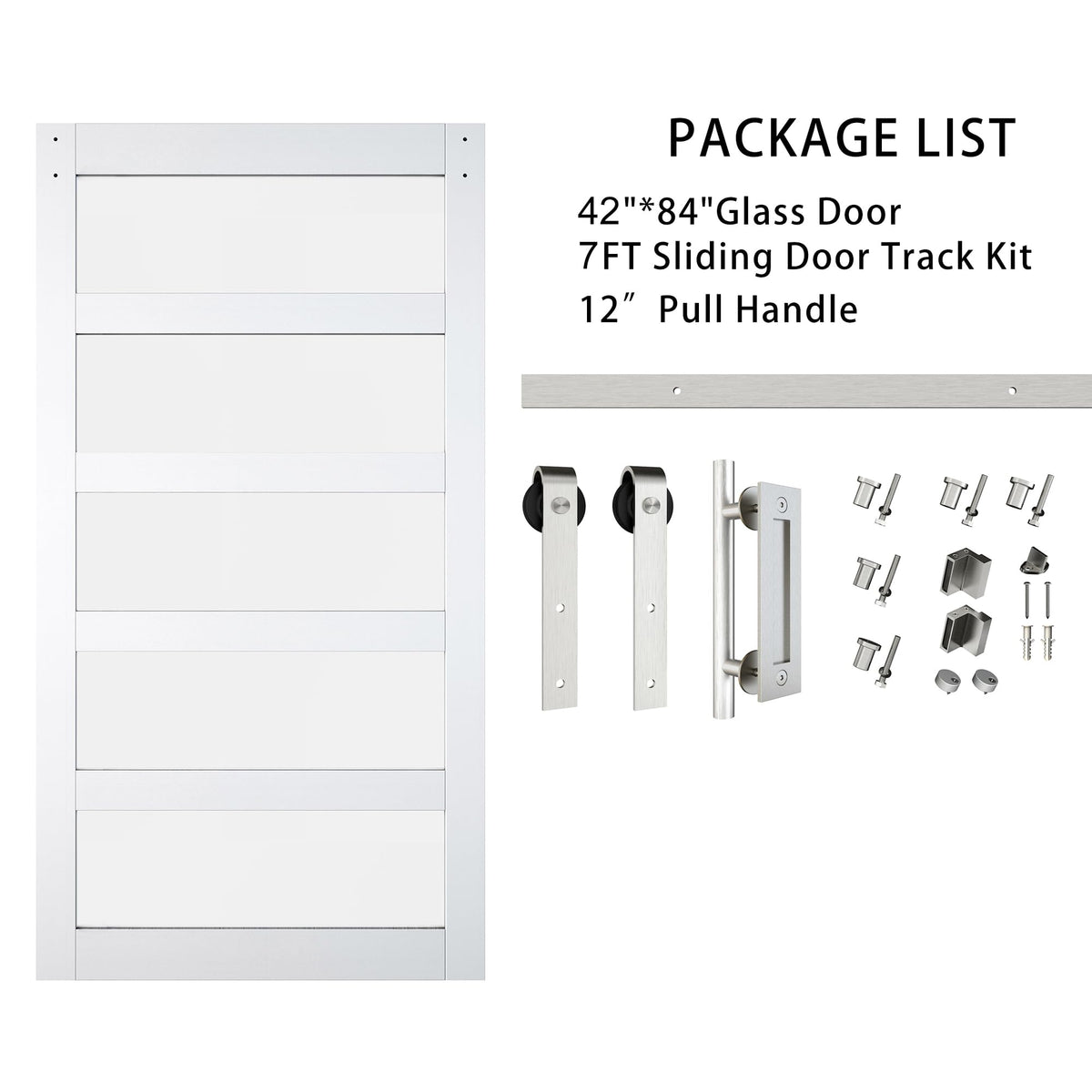 42in x 84in Glass Barn Door with 7FT Sliding Door Hardware Kit Included & Handle,5-Panel Frosted Glass Solid Wood Slab with Water-Proof PVC Surface,Pre-Drilled Easy Assembly,White For bathroom,closet,pantry,living ro0m ,bedroom,etc.