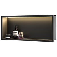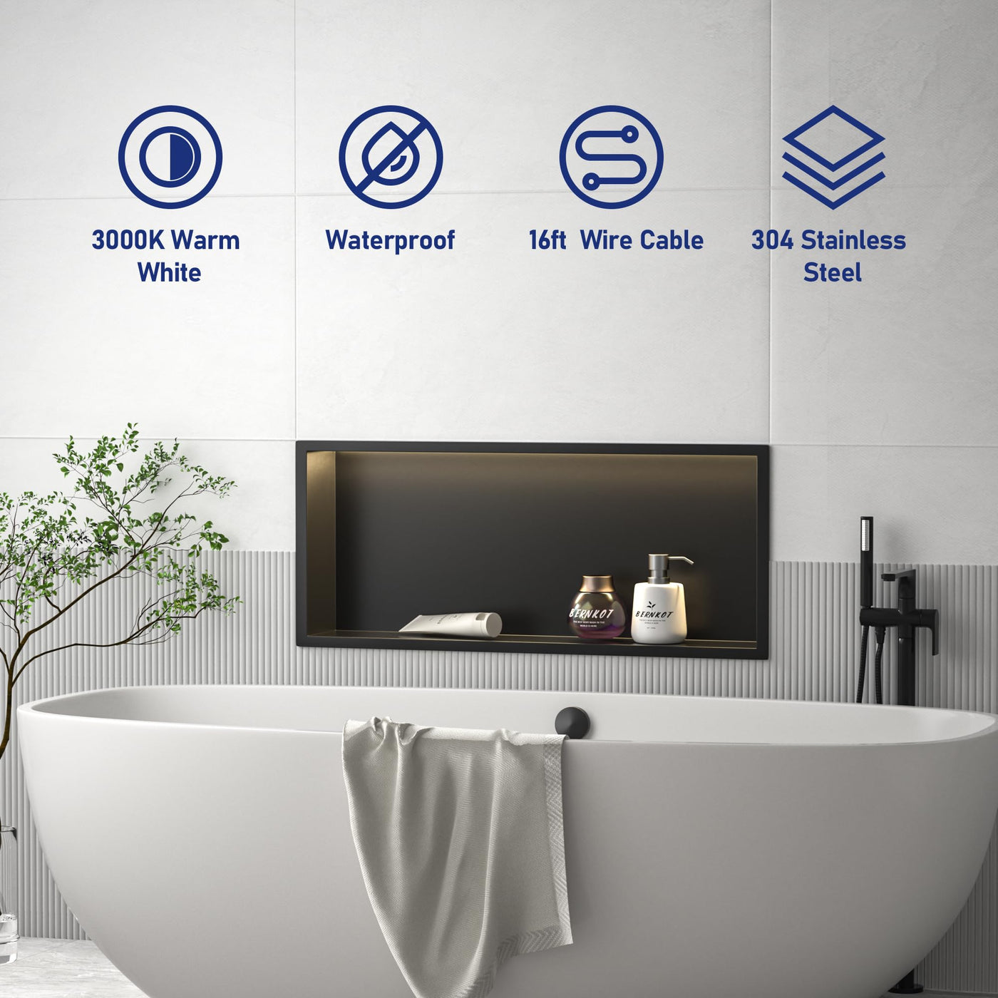 Q: Is the LED light in the shower niche dimmable?A: The integrated LED strip in the Bernkot shower niche is non-dimmable; however, it is compatible with a dimmer switch and a dimmable driver, allowing for adjustable lighting.