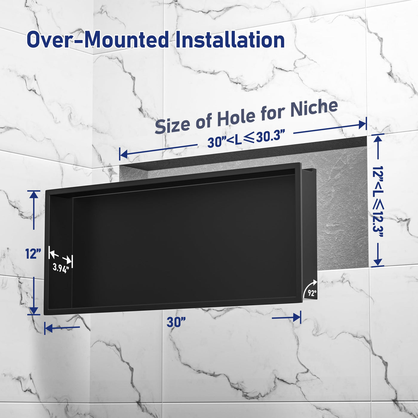Q: What are the dimensions of the Bernkot Stainless Steel Shower Niche?A: The Bernkot Stainless Steel Shower Niche measures 30 inches in length, 12 inches in height, and 3.94 inches in width, making it a perfect fit for most bathroom walls.