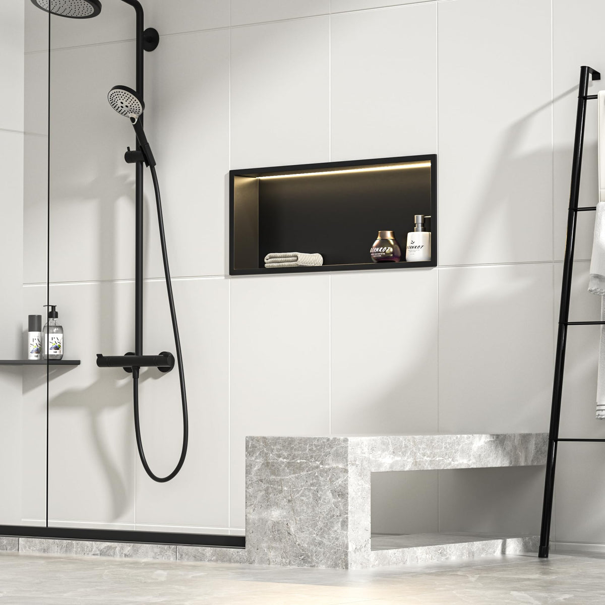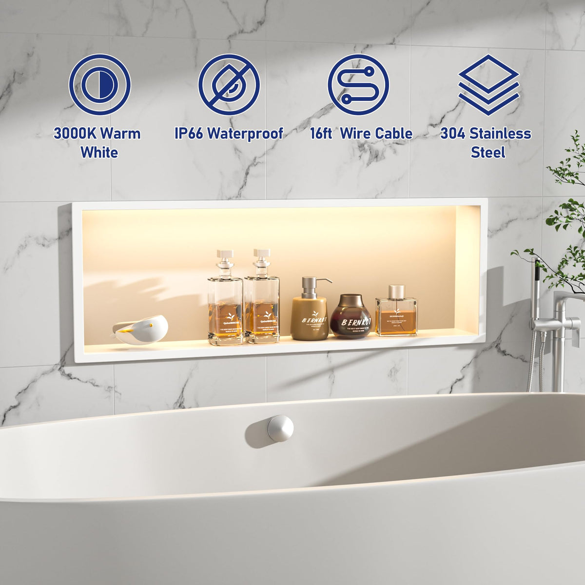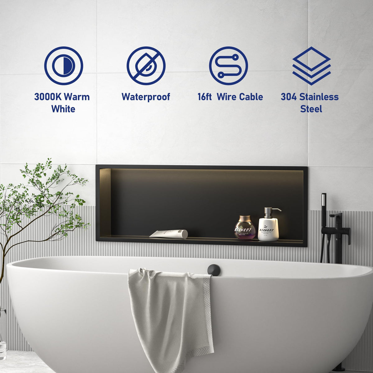 Q: Is the lighting in the shower niche waterproof?A: Yes, the LED light strip in the Bernkot Shower Niche is waterproof with an IP66 rating, making it suitable for use in wet bathroom environments.