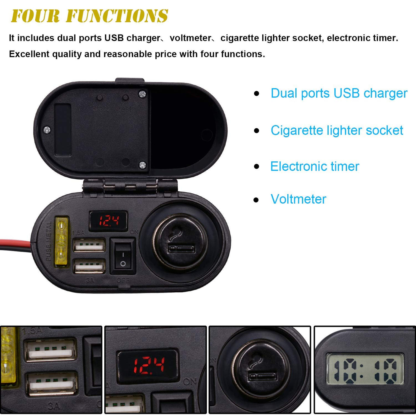 Specifications: Weight: 234g Size: 7.4*8*4cm Cable length: 145cm Power Input: DC 12V/24V Output Voltage: 5V Output Current: 3A Voltmeter test range: 10-29V Installation: Rear view mirror bracket or handlebar bracket Materail: High and Low Temperature Resistant Environmental Protection ABS Material Wiring Connection: The Red wire: connect the anode of the storage battery. The Black wire: connect the cathode of the storage battery. Package Included: 1 x Motorcycle Dual USB Charger Socket with Cigarette Lighter Socket and Voltmeter 1 x Fixed Screws 1 x Rear View Mirror Bracket 1 x Handlebar Bracket 1 x Cigarette Butts