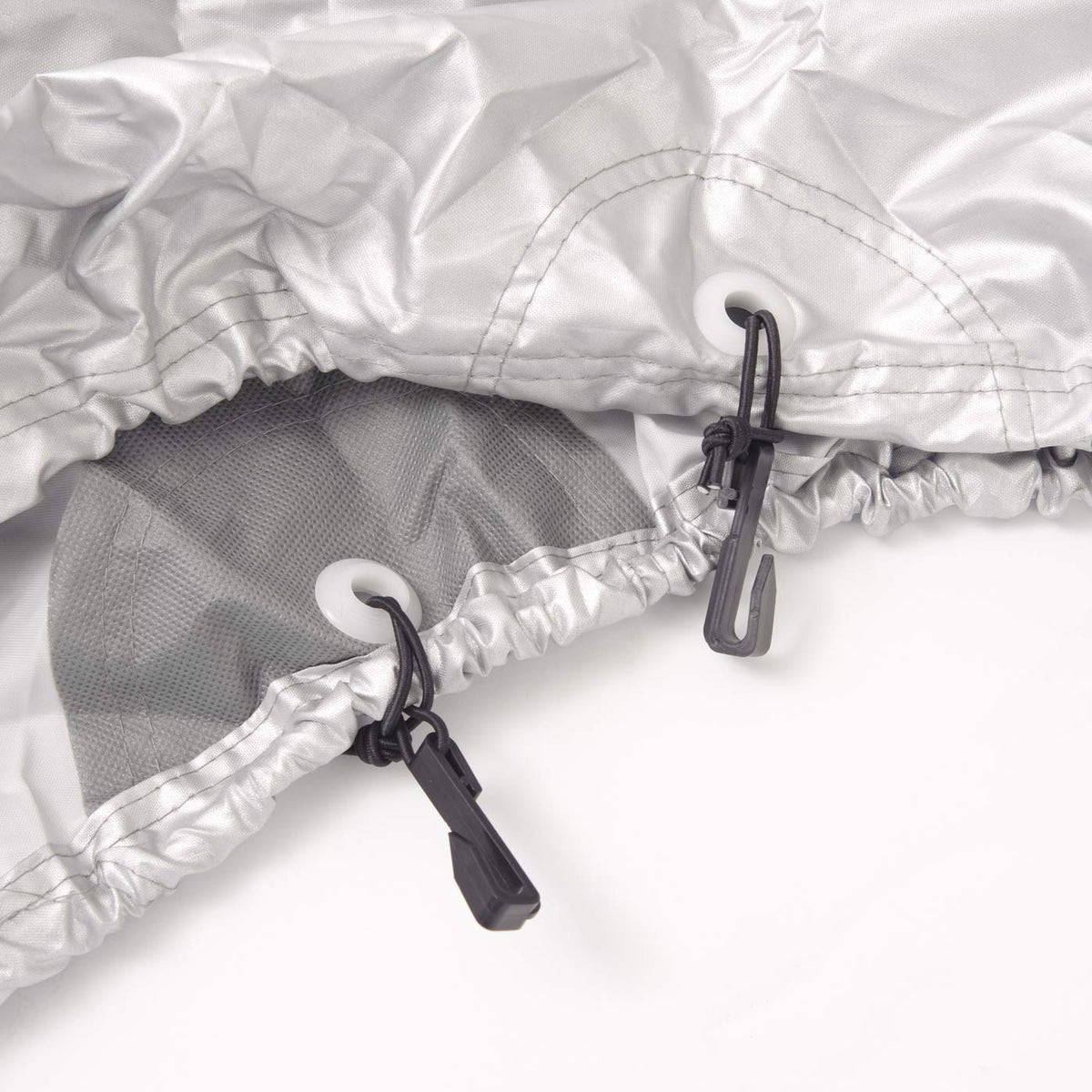 Q: How does the motorcycle cover stay secure during windy conditions?A: The cover features a full elastic hem that helps keep it securely in place on your motorcycle, preventing it from blowing away in windy conditions.