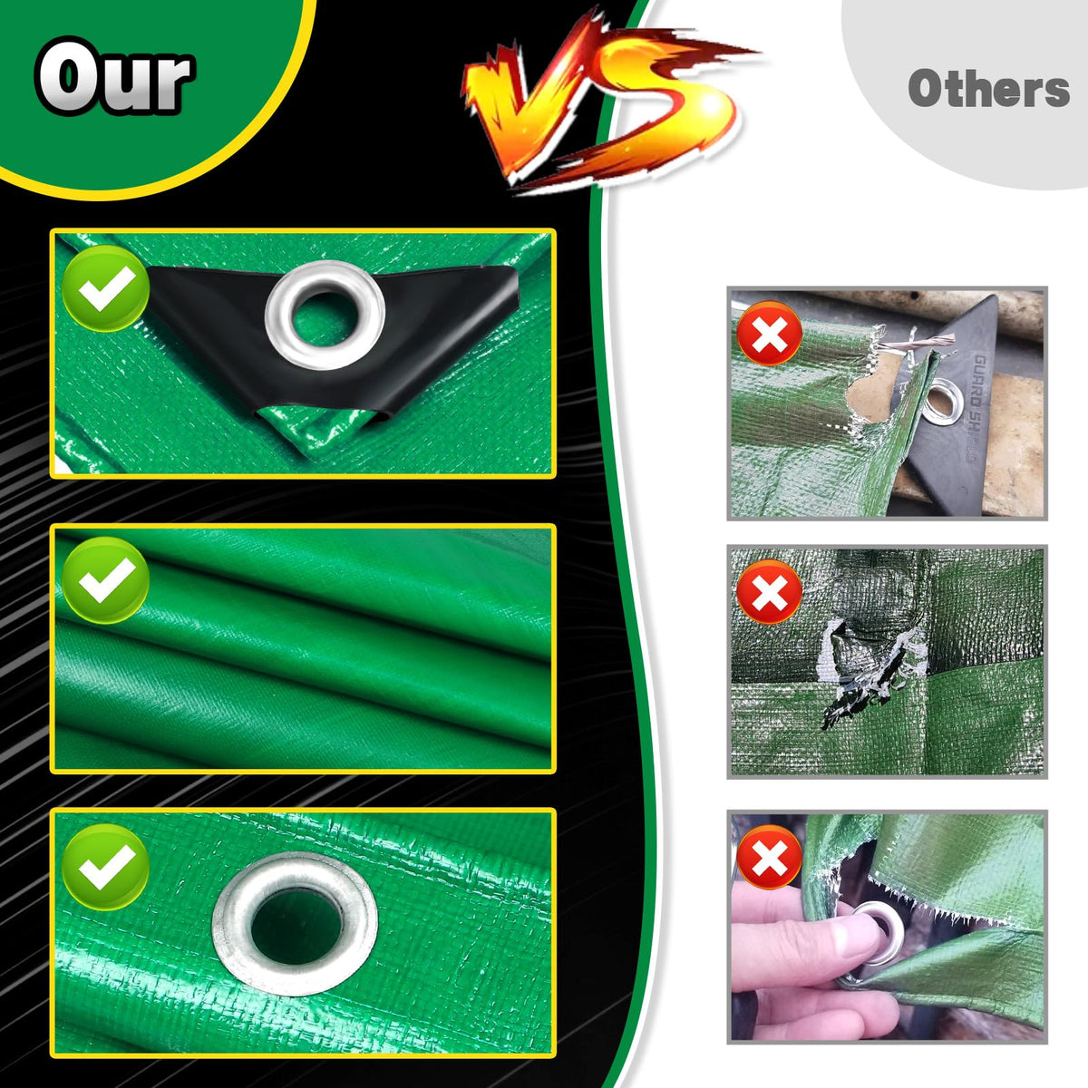 Q: How do I secure the tarp properly?A: The tarp is designed with anti-rust grommets every 20 inches, allowing for easy securing and tying down. You can use ropes, bungee cords, or stakes to anchor the tarp in place, ensuring it stays secure even in windy conditions.