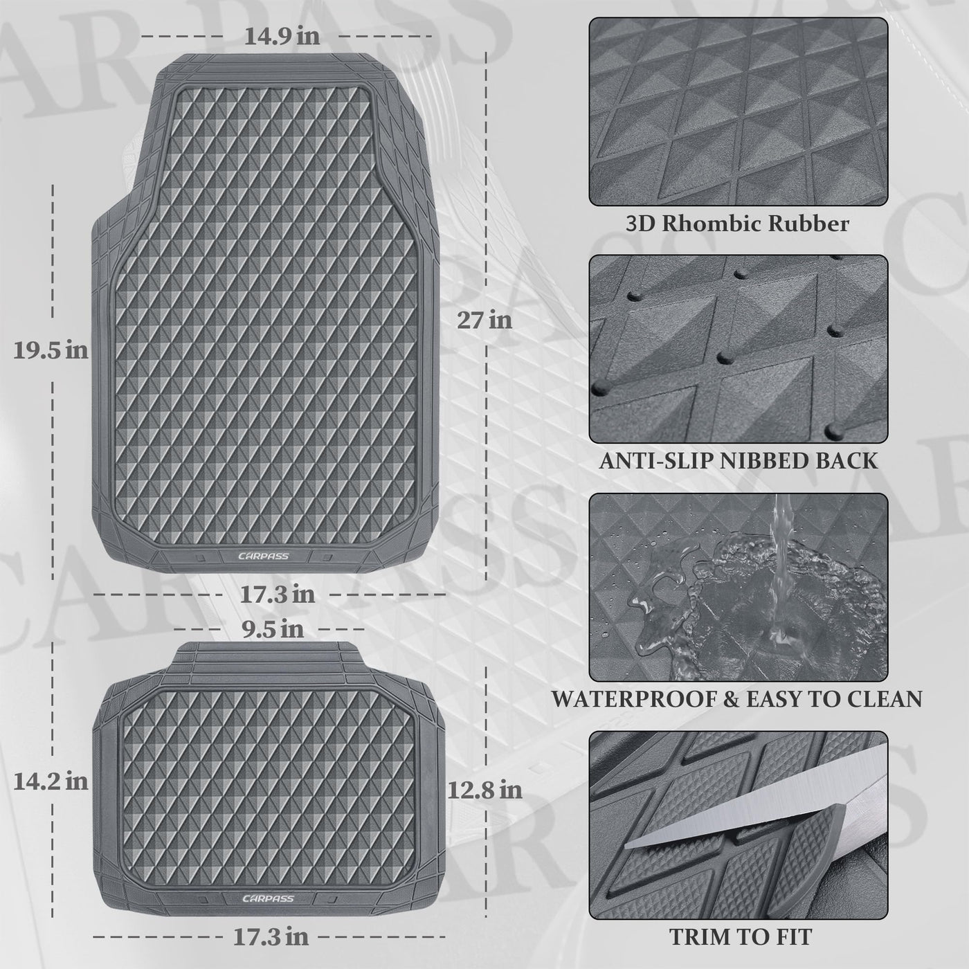 CAR PASS Gray Rubber Car Mats, All-Weather Floor Mats Full Set Durable Anti-Slip 3D Rhombus Waterproof Automotive Pad Trim to Fi