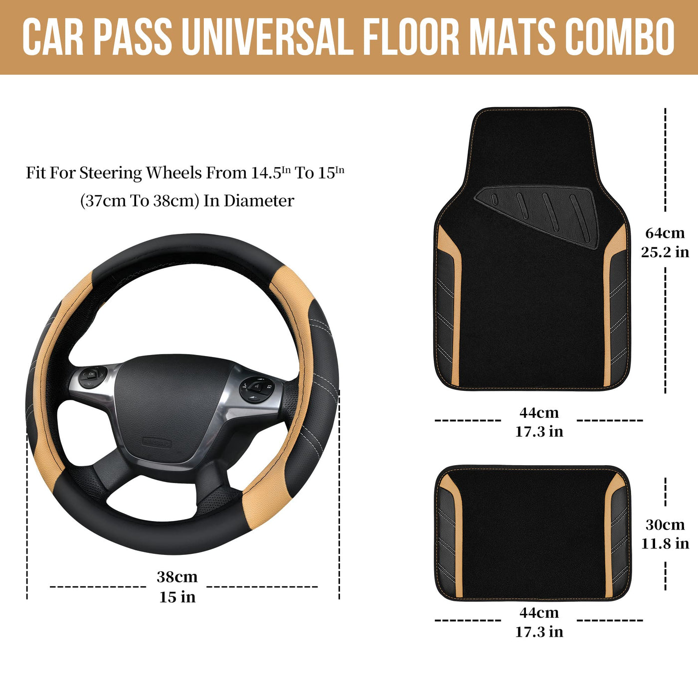 'HIGH QUALITY - Our Sporty Steering Wheel Cover is made of Microfiber Leather, premium and durable, protects your steering wheel cover from sunburn, scratches, cold, moisture, wear and dirt. Odorless TPR inner grip protects your health. ANTI SLIP DESIGN - The rubber inner ring adds a non-slip line, make sure the steering protector won't move during driving. Keep your safety all the time, and you will be able to better control the steering wheel.Heavy Nibbed Backing To Keep The Mats Securely In Place. Offer Protection for Your Car's Interior and Safety Features for You. EASY TO INSTALL - We suggest warming up the steering wheel cover in the sun or use a hair dryer first, and then install it according to our tutorial, which will make your installation process easier and more effective. Dimensions - Shape and Size is Engineered to Fit Most Cars, Trucks, Vans and SUVs. Front (25.2''L x 17.3''W) Rear (11.8''L x 17.3''W) - Please Make Sure to Check Measurements Before Installation. UNIVERSAL FIT - Fits all standard steering wheels 14.5'' to 15'' for vehicles, suvs, vans and trucks. Our Brand ''CAR PASS''. We offer high quality Car Accessories to you. We put product quality and your trust first. Do our best to provide you with quality service.''