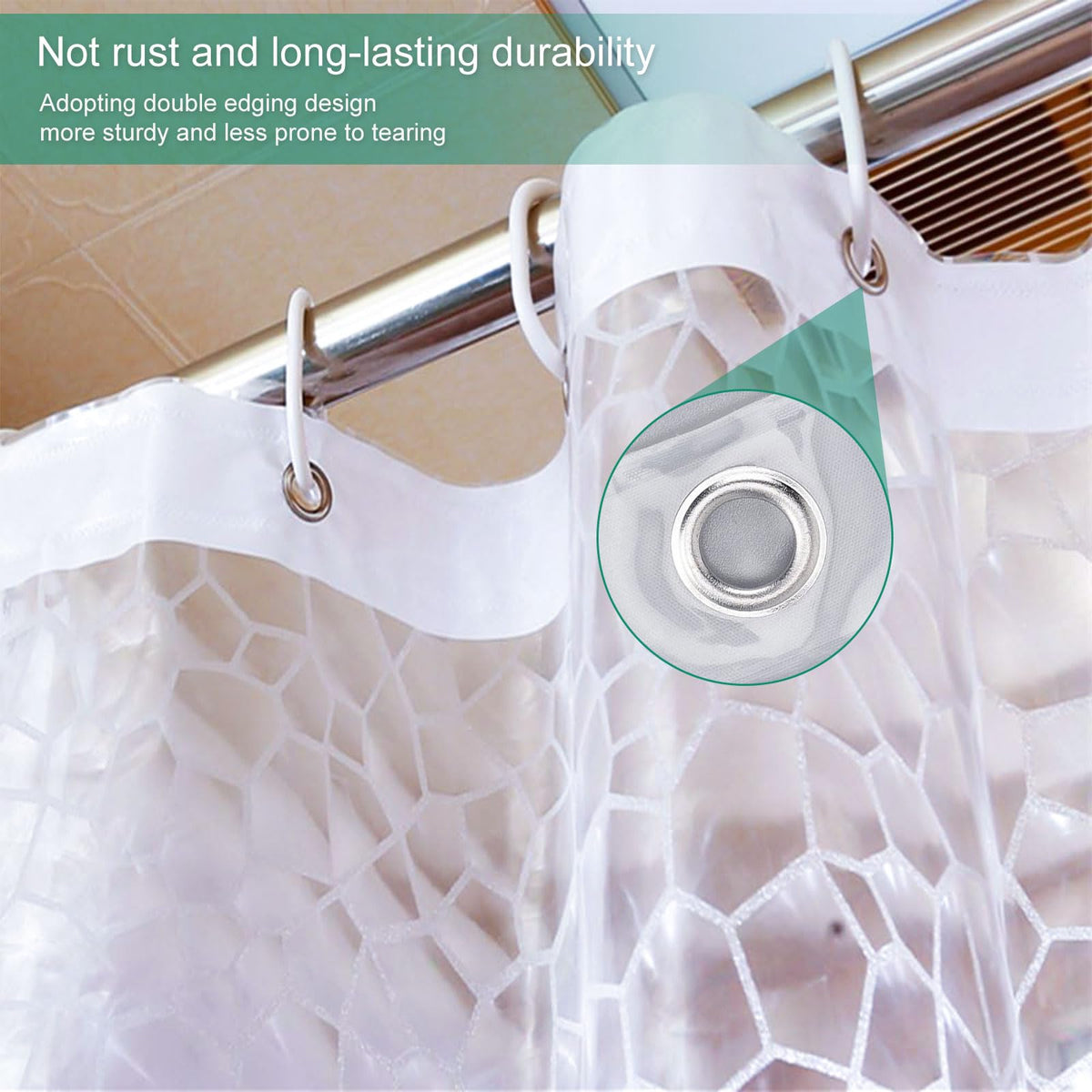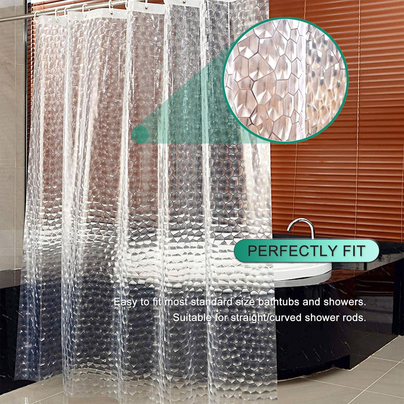 Q: Is the shower curtain liner waterproof?A: Yes, this shower curtain liner is made from 100% EVA material, which is water repellent and waterproof, ensuring that it effectively keeps water in the shower area.