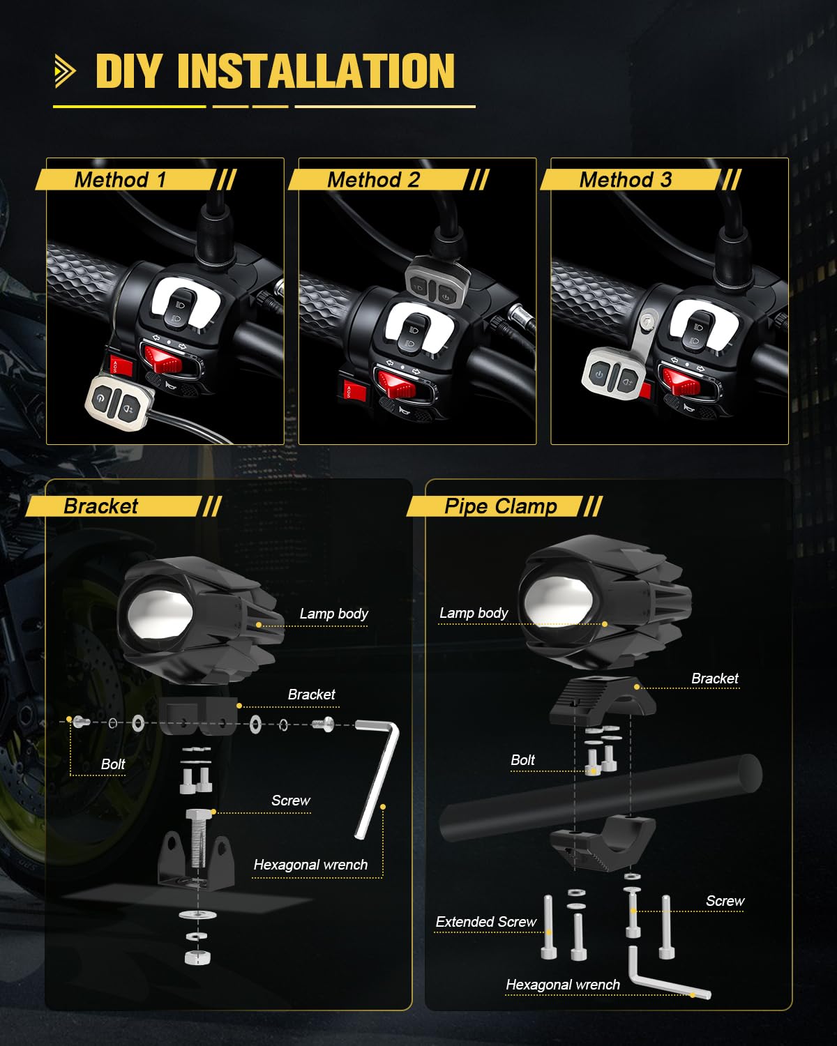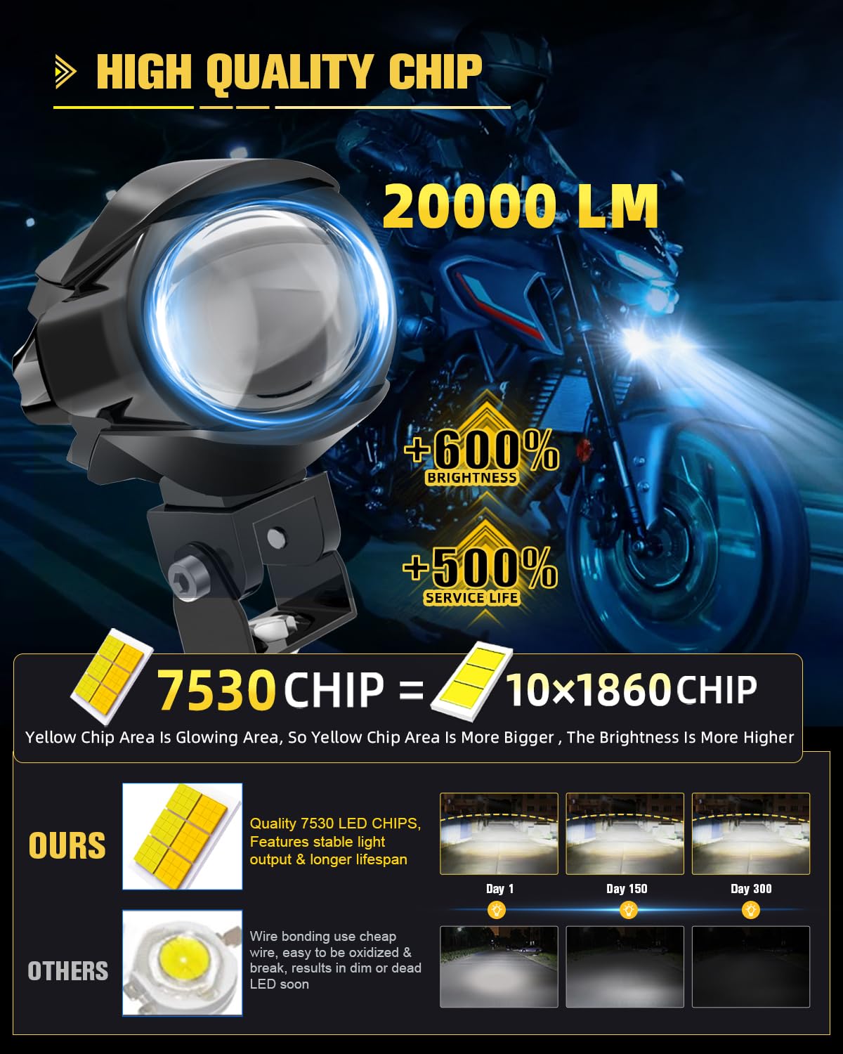 Exceptional Performance: CO LIGHT motorcycle LED fog lights stand out from other similar priced products with only one or two lighting modes. Our lights offer 3 constant lighting and 4 strobe lighting modes: constant white(high beam with 6500K 10000LM), constant amber fog light(low beam with 3000K 8000LM), constant white+amber(combined beam), white strobe simultaneously and alternately, amber strobe simultaneously and alternately. Whether it's night, rainy, snowy, or foggy, these dual color LED lights help you see the road ahead clearly and avoid obstacles promptly.