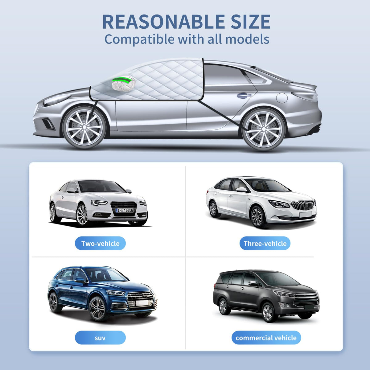 Struggling through the snow in the morning, especially if youre a daily commuter or winter driver without the luxury of a garage, can be a tough start to your day. Imagine you're parked overnight, and a snowstorm decides to blanket your car. Now, picture waking up the next morning with a sleek solution that spares you the back-breaking effort of scraping snow off your windshield, side mirrors, and even the front side windows. Thats where this all-in-one, heavy-duty windshield cover steps in! Designed specifically for the winter warriors-whether youre a single city dweller, a busy parent, or someone enjoying retirement-this cover provides top-tier protection. No matter if you're parking in your home driveway, on the street, or at a crowded work parking lot, this snow shield has you covered-literally. Youll no longer spend precious morning minutes chiseling away at ice; instead, a quick removal of this cover reveals a clear windshield, ready to go! Plus, the reinforced, padded design ensures it's sturdy enough to withstand those brutal Minnesota blizzards, while the elastic straps that hook around the front wheels, and the five embedded magnets, keep the cover securely in place during even the strongest gusts of wind. And dont worry about fit-it accommodates a wide range of vehicles, from sedans to SUVs.