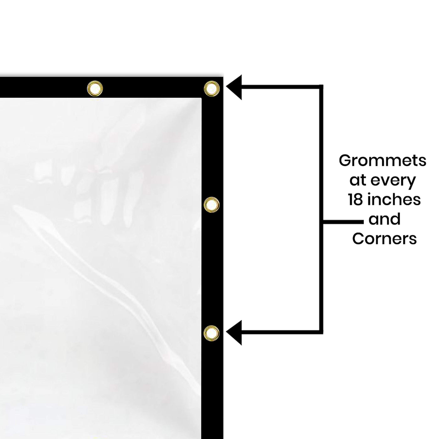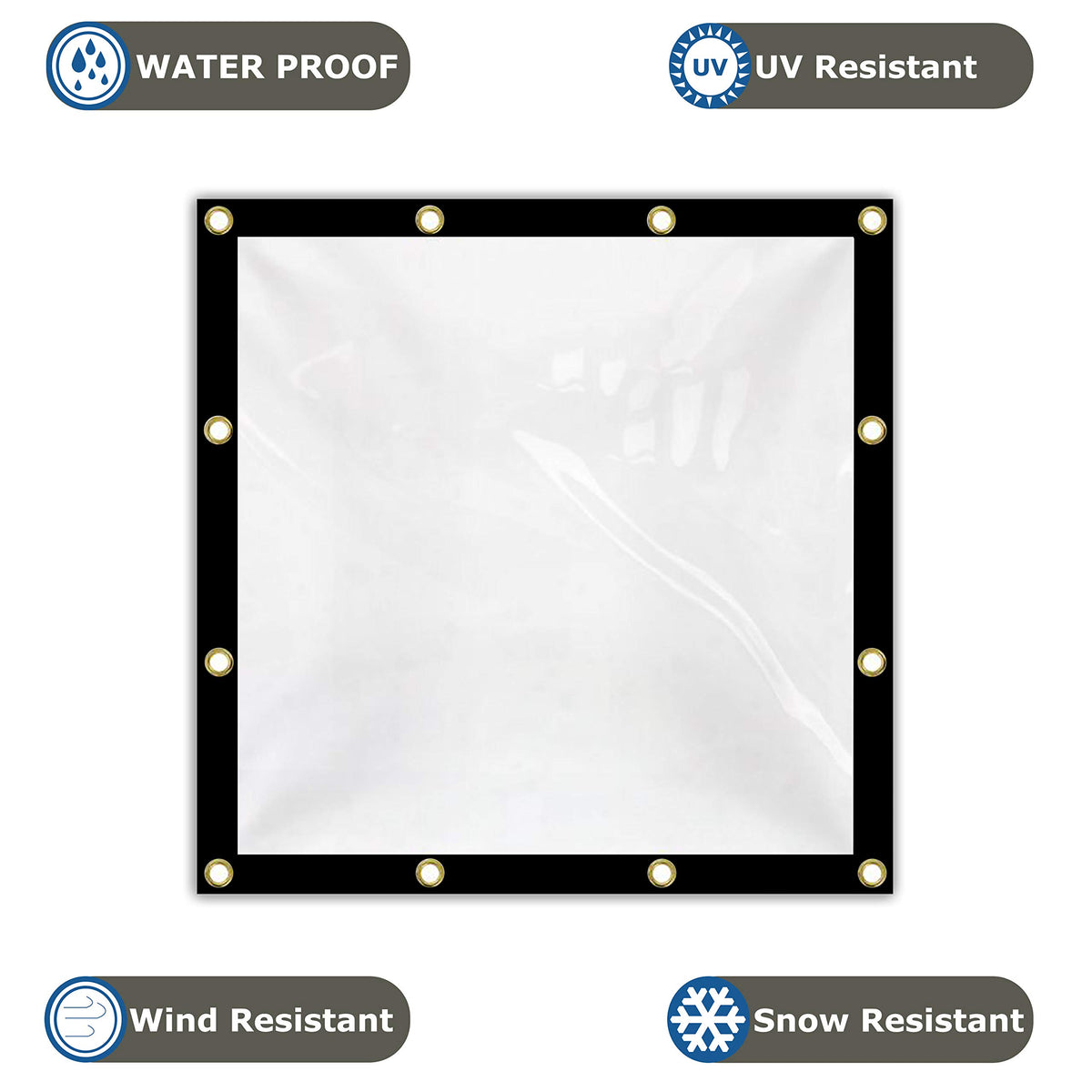 Q: What are the key features of the clear vinyl tarps?A: The clear vinyl tarps are made from waterproof and tear-resistant vinyl coated PVC material, weighing 18 oz with a thickness of 20 mil. They are UV-resistant, ensuring durability and longevity in various weather conditions. The tarps come with rustproof brass grommets for easy installation and are designed to endure a temperature range from 14 to 122 degrees F.