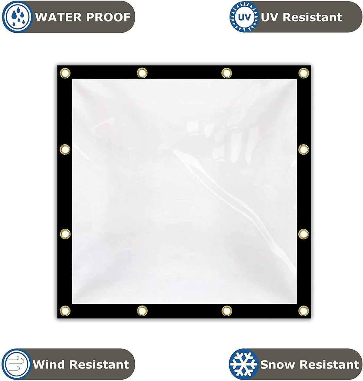 Q: What are the main features of the clear tarp?A: The clear tarp is made from waterproof and weather-resistant vinyl coated PVC material, weighing 18 oz with a thickness of 20 mil. It is tear and abrasion resistant, equipped with rust-proof brass grommets for easy installation, and can withstand temperatures ranging from 14°F to 122°F.