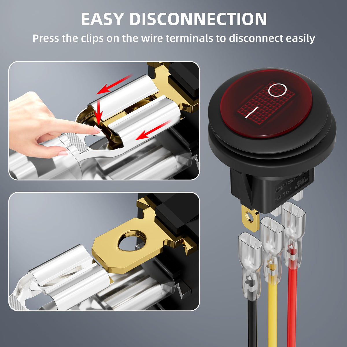 Powerful Function: The rating of this round rocker switch is 12V DC/20A, red led lighted design, which will light up to enhance visibility when turning on the switch. UL Listed: This waterproof rocker switch is UL listed, is made of superior nylon materials, which is reliable and durable for use. Easy to Install: The installation hole size for the round toggle switch is 0.8''. And it features a snap-in installation design for easy installation, with a bilge to ensure secure mounting, preventing unwanted rotation. Features: The illuminated rocker switch 12v features a button labeled ''O I'', 3 pins and SPST design, and will come with a set of wires for convenient installation. Waterproof: This 12v rocker switch is waterproof design, is applicable for both automotive and marine use, suitable for car, truck, utv, atv, boat, etc.