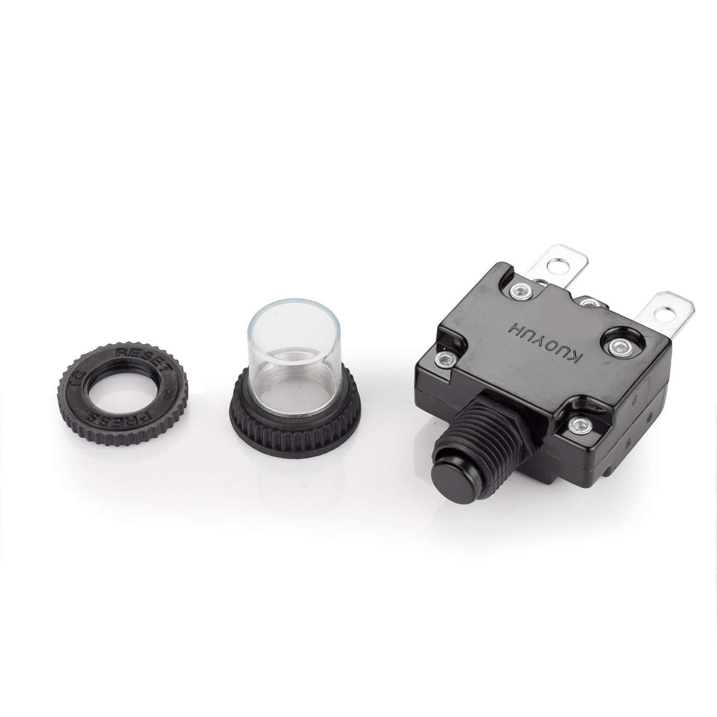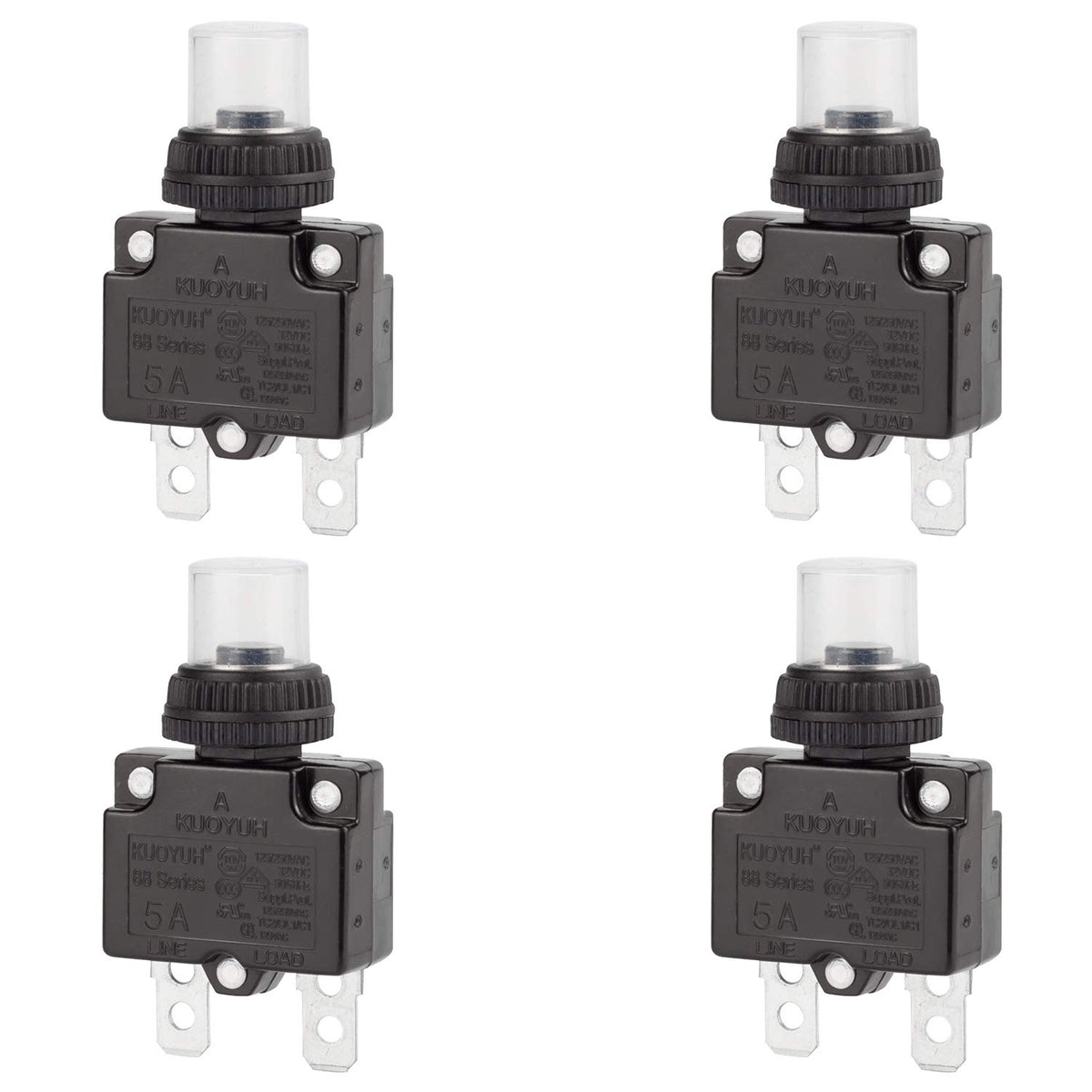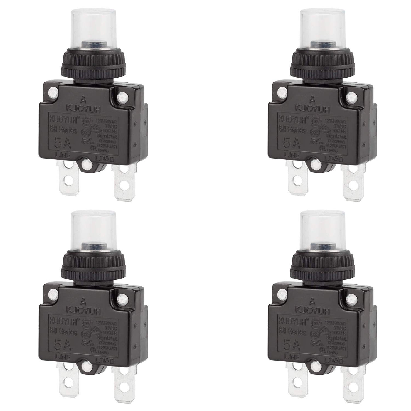 DIYhz 5Amp Circuit Breakers Thermal Overload Switch Protector 88 Series Manual Push Button Reset with Quick Connect Terminals and Waterproof Button Cap 32VDC or 125/250VAC 4PCS