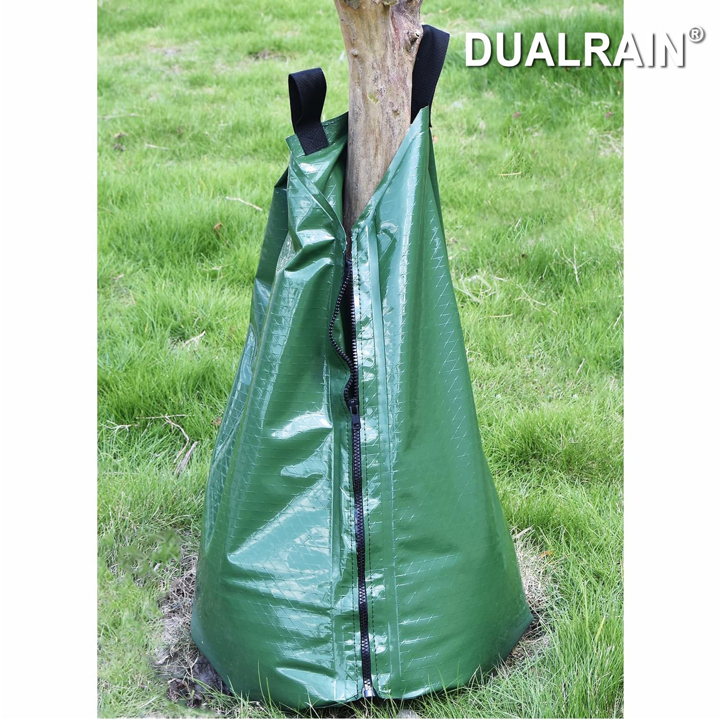 Q: How do I properly fill and use the DUALRAIN tree watering bag?A: To use the DUALRAIN tree watering bag, wrap it around the tree trunk, zip it up, and fill it to about 1/4 capacity. Then, gently lift the two black straps at the top to ensure the bottom expands fully. Check the drainage holes if the water stops running out.