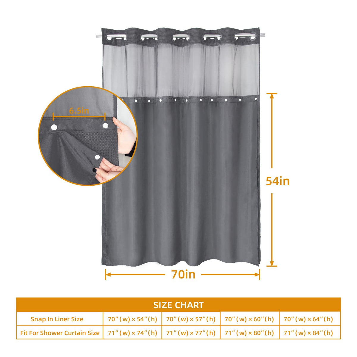 Eachope 1 Pack Fabric Snap-In Shower Curtain Liner Replacement,Compatible With No Hook Shower Curtain With Snap In Liner, Removable & Water-Repellent,Machine Washable,70X54,Grey