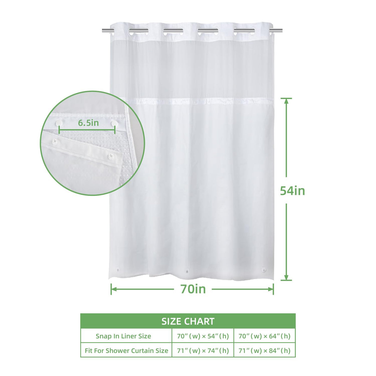 Q: What size is the EACHOPE shower curtain liner and will it fit my shower?A: The EACHOPE shower curtain liner measures 70 inches by 54 inches, making it compatible with standard-sized no-hook shower curtains that are 71 inches by 74 inches.