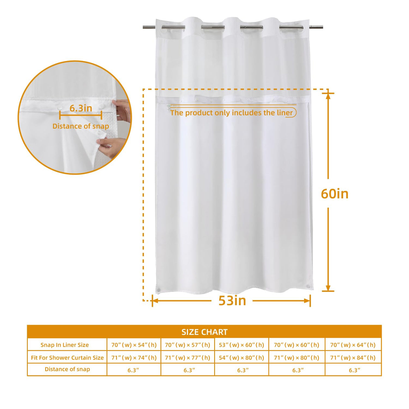 Eachope 1 Pack Stall Fabric Snap-In Shower Curtain Liner Replacement,Compatible With No Hook Shower Curtain With Snap In Liner, Removable & Water-Repellent,Machine Washable,53X60,White