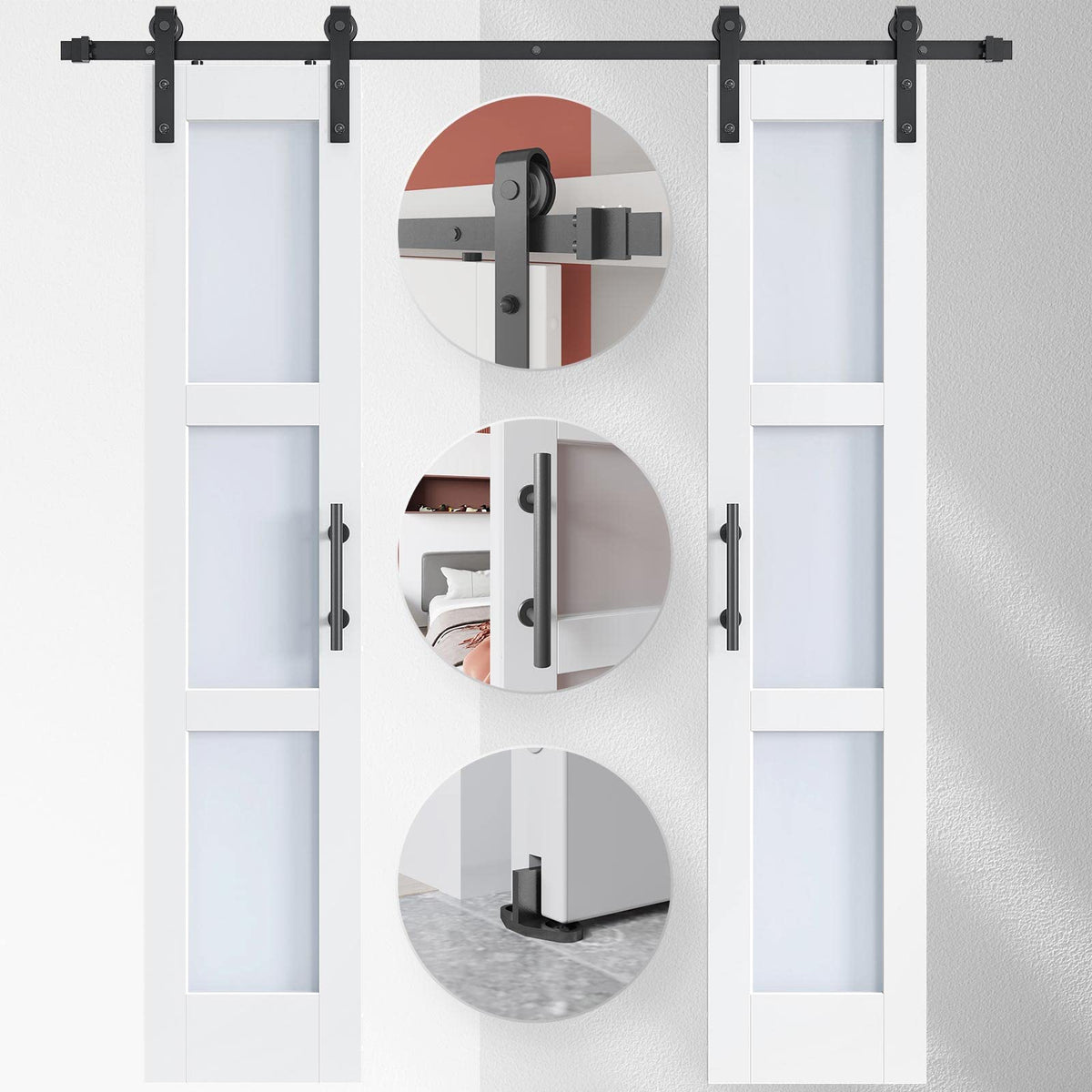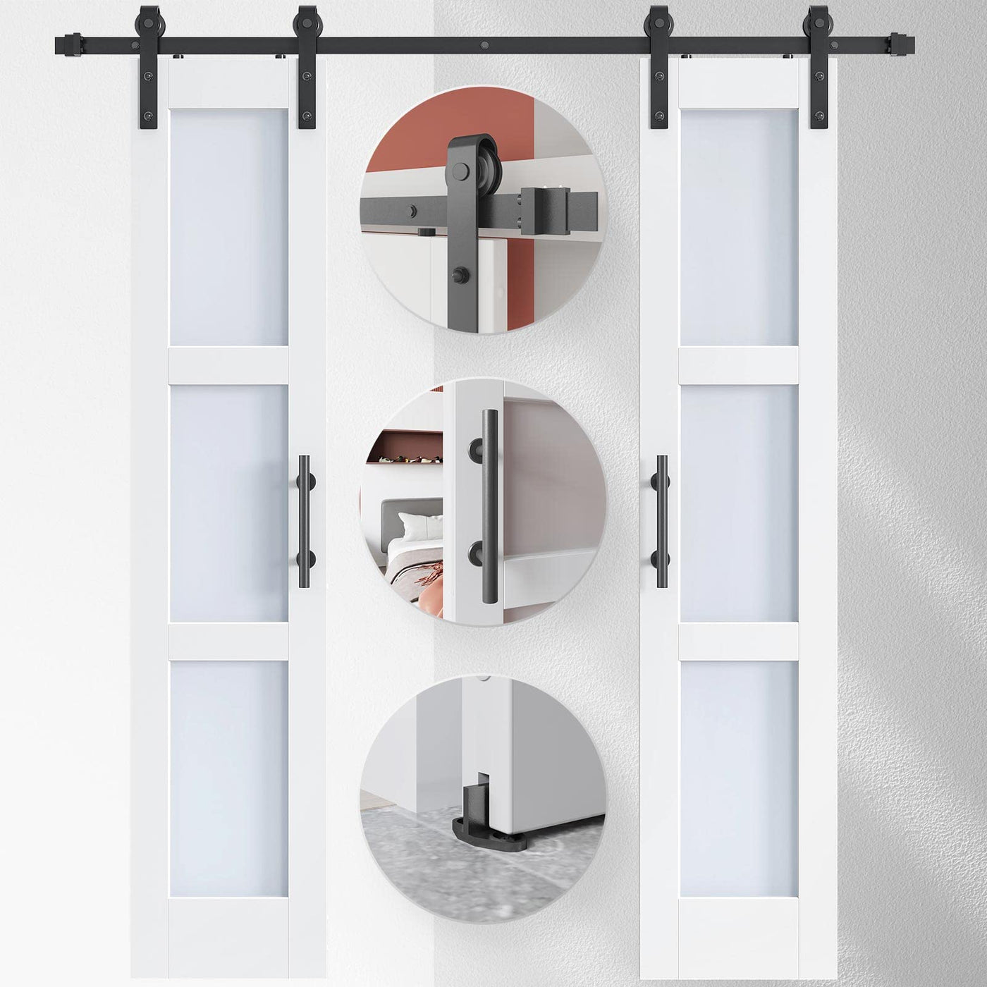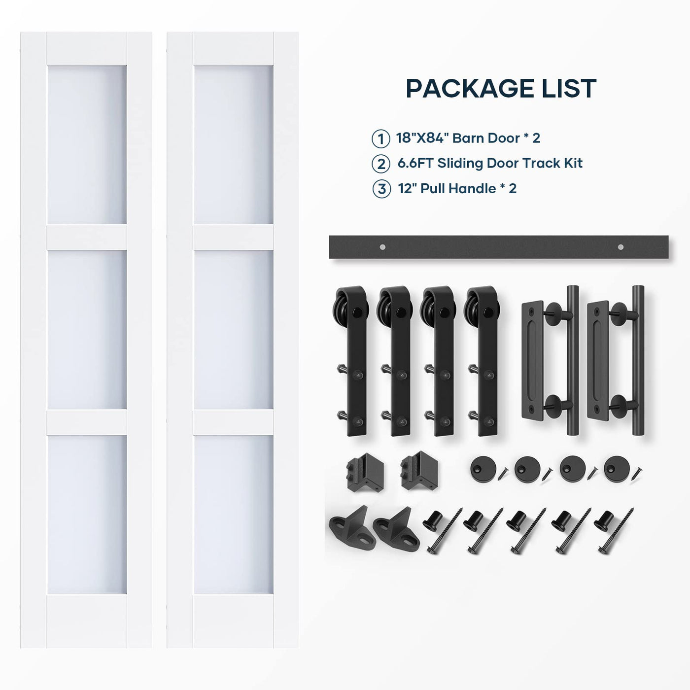 Q: What is included in the package when purchasing the barn door?A: The package includes an 18"x84" double door, a 6.6FT double sliding track kit, two 12" handles, and an installation manual, ensuring you have everything needed for setup.