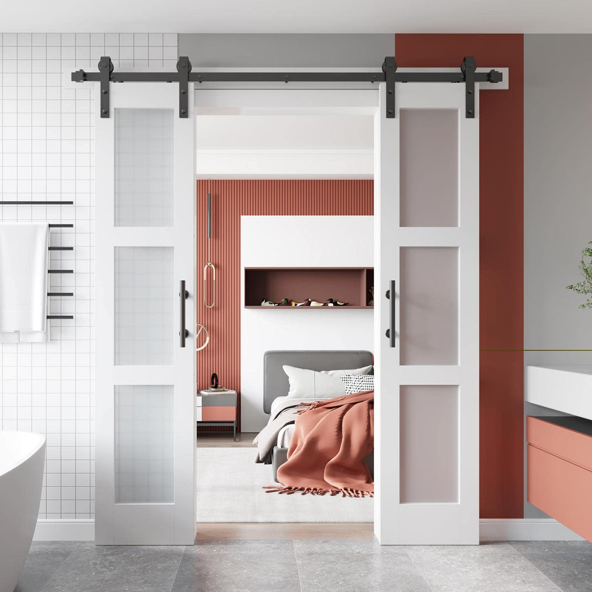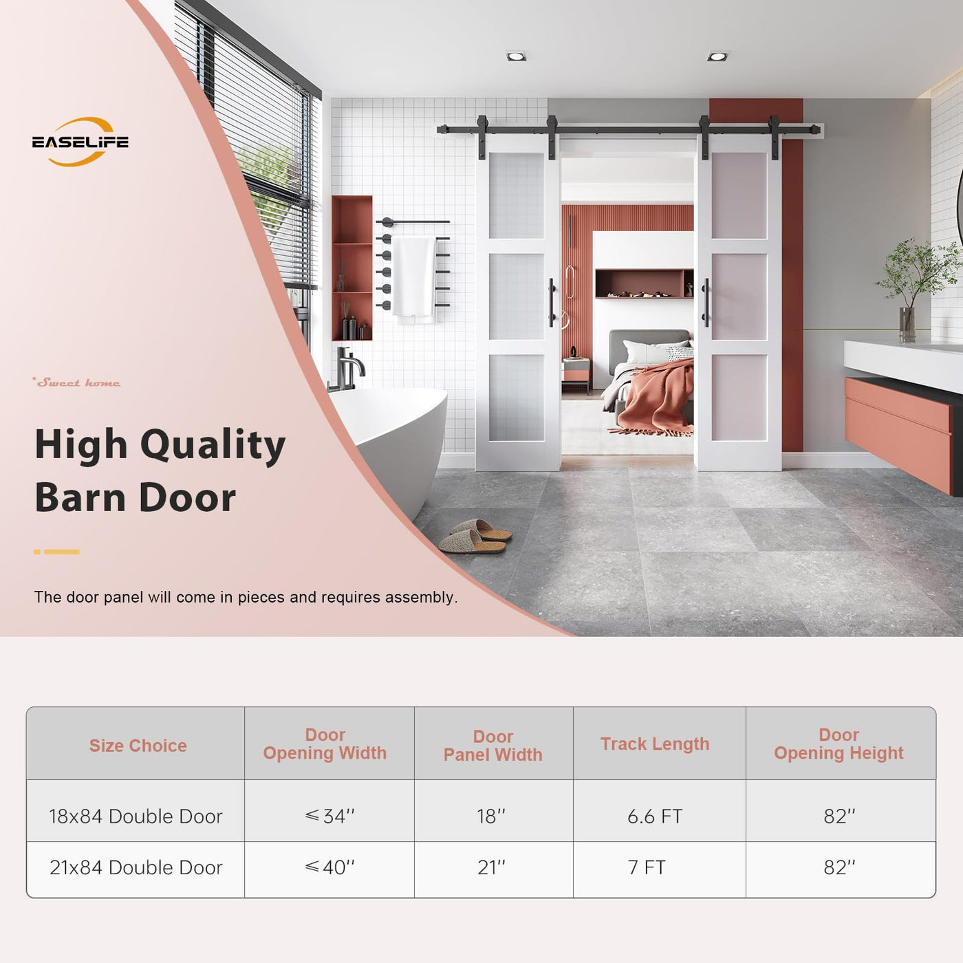 EaseLife 36in x 84in (Double 18in×84in Door) Glass Barn Door with 6.6FT Sliding Door Hardware Kit Included & Handle,Solid LVL Covered with Water-Proof PVC Surface,DIY Assembly,3-Panel Glass,White