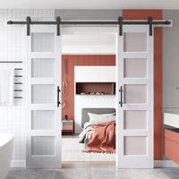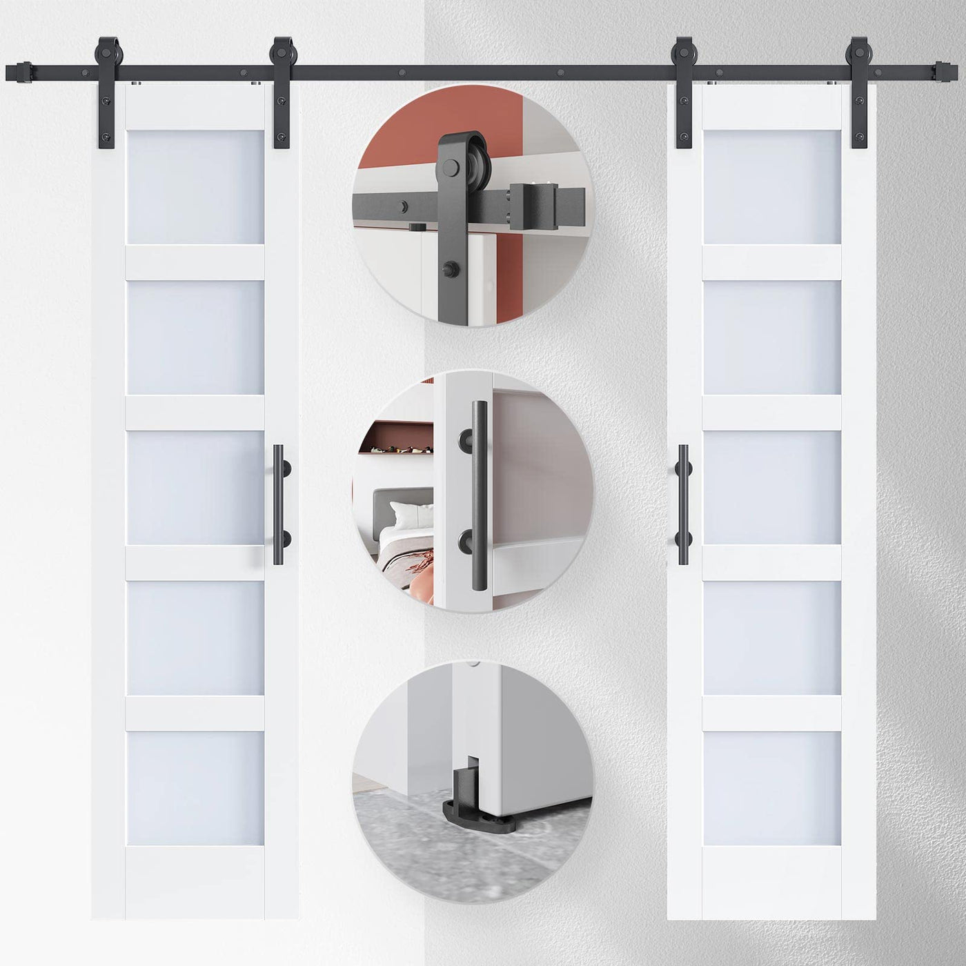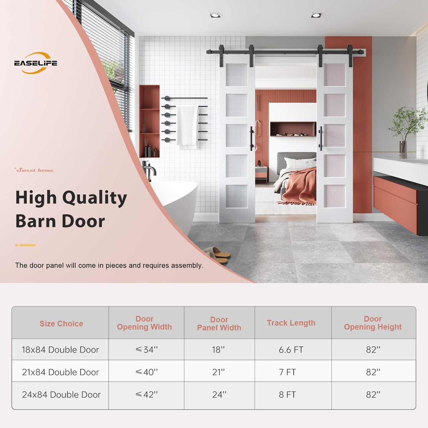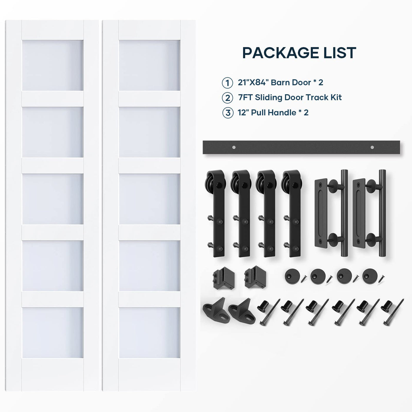 EaseLife 42in x 84in (Double 21in×84in Door) Glass Barn Door with 7FT Sliding Double Door Hardware Kit Included & Handle,Solid LVL,Water-Proof Surface,DIY Assembly,5-Panel Glass,White