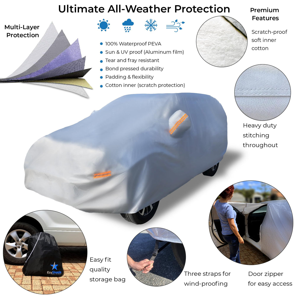 Q: Is the EzyShade car cover waterproof?A: Yes, the EzyShade car cover is made from advanced materials that are 100% waterproof, providing excellent protection against rain and snow while keeping your vehicle dry.