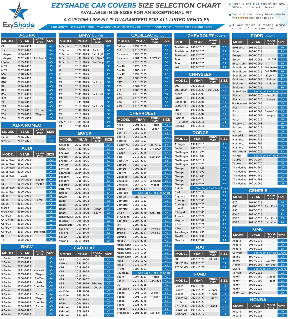 EzyShade Waterproof All Weather Car Covers are available in 29 sizes for a custom-like fit, guaranteed! Simply find your vehicle in the easy read Size Chart in images 4-6 above. EzyShade car covers are made of the latest, most durable and hard wearing outer materials with a soft cotton inner lining, perfectly designed to keep your vehicle fully protected in all weather conditions. High quality materials coupled with innovative design tweaks, EzyShade car covers are the ultimate all weather car covers, providing absolute protection against rain, snow, wind, dust, sun and UV rays. Additional modifications and features offer style and convenience. Every car cover is machine cut to ensure a consistent secure fitting look, a protected side zipper offers easy access into your vehicle, anti-theft grommets allow you to better secure your car cover, reflective strips provide night visibility, and a quality, appropriately sized storage bag offers easy storage when not in use. With a size perfect for almost every sedan, SUV, hatchback, station wagon, coupe and pickup truck, you can find the right cover for your car in the Vehicle Size Chart right now.