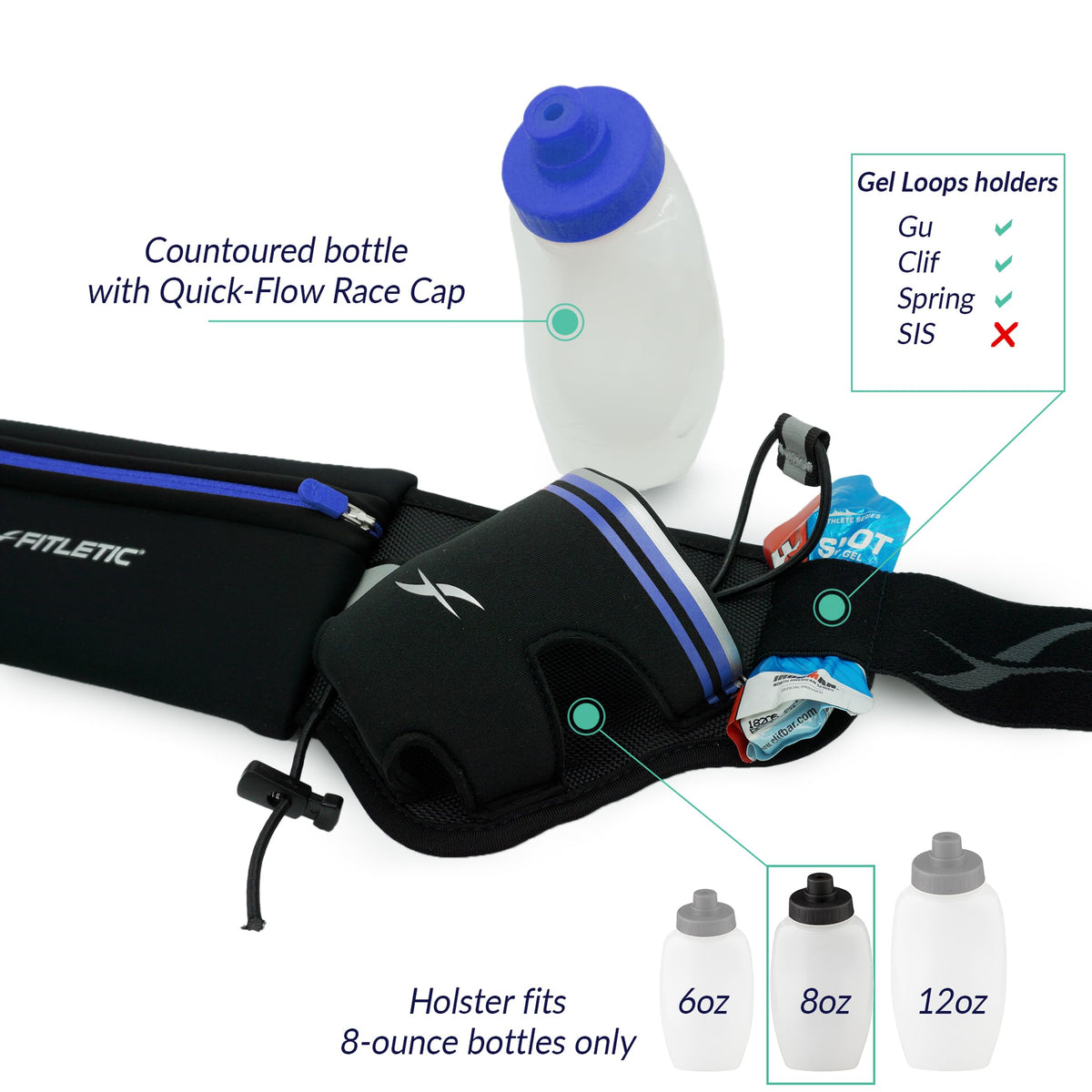Q: What features make the Fitletic Hydration Running Belt different from others?A: The Fitletic Hydration Running Belt features a patented bounce free design, lightweight and water-resistant material, and quick draw hip holsters for easy access to hydration without interruption during your run.
