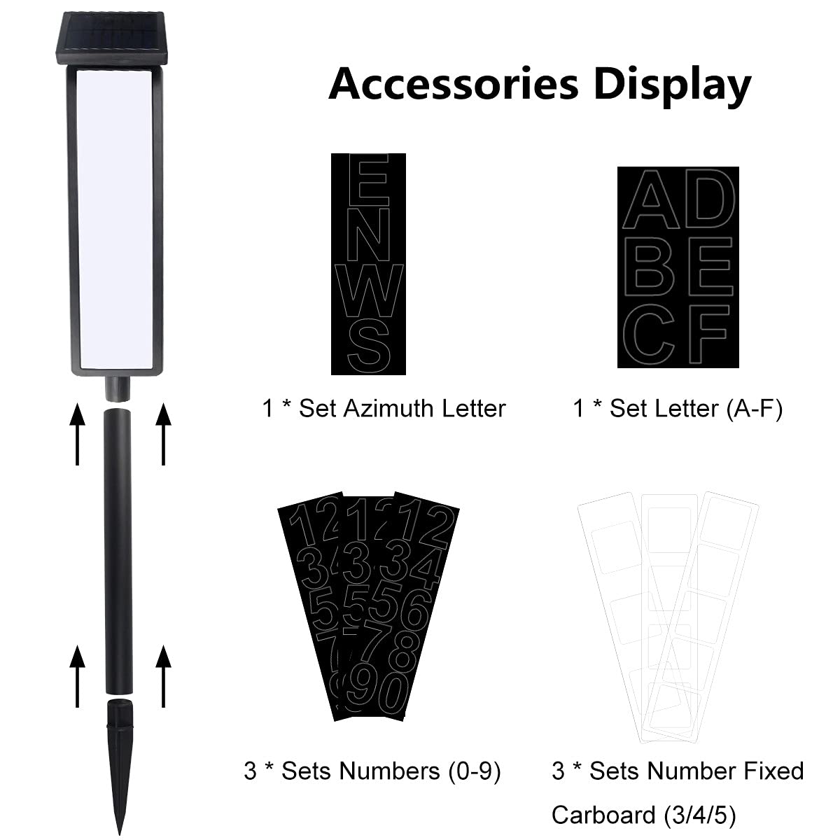 Package Include 1 x Solar house numbers lights 3 x Numbers (0-9) 1 x Letters (A-F) 1 x Azimuth letters (E, W, S, N) 3 x Number sheet