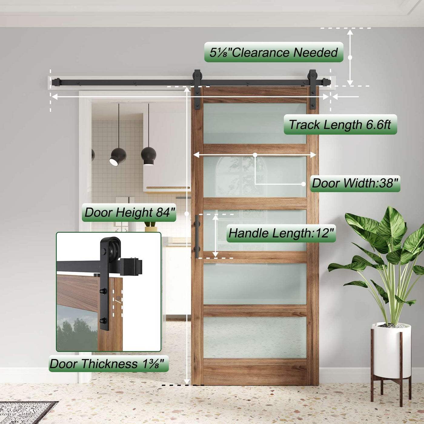 Q: What are the dimensions of the FREDBECK Glass Barn Door?A: The FREDBECK Glass Barn Door measures 38 inches in width and 84 inches in height, making it suitable for openings between 35 inches and 37 inches.