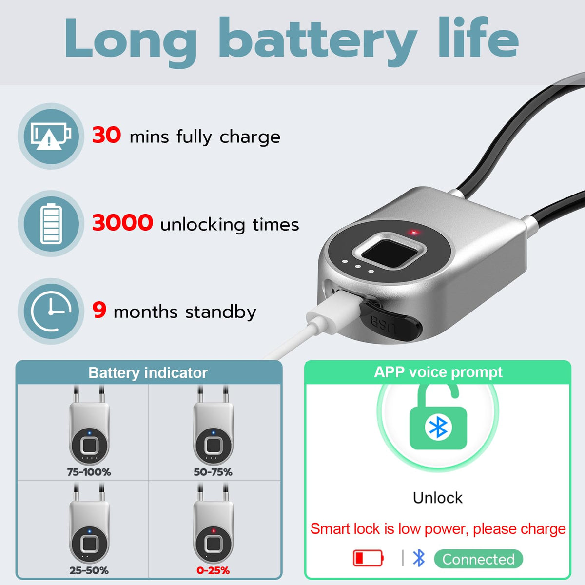 Q: How long does the battery last on the Dhiedas Fingerprint Cable Lock?A: A full charge of the lock can last up to 6 months, providing approximately 3,000 unlocks. When the battery is depleted, you can easily recharge it using a micro USB cable.