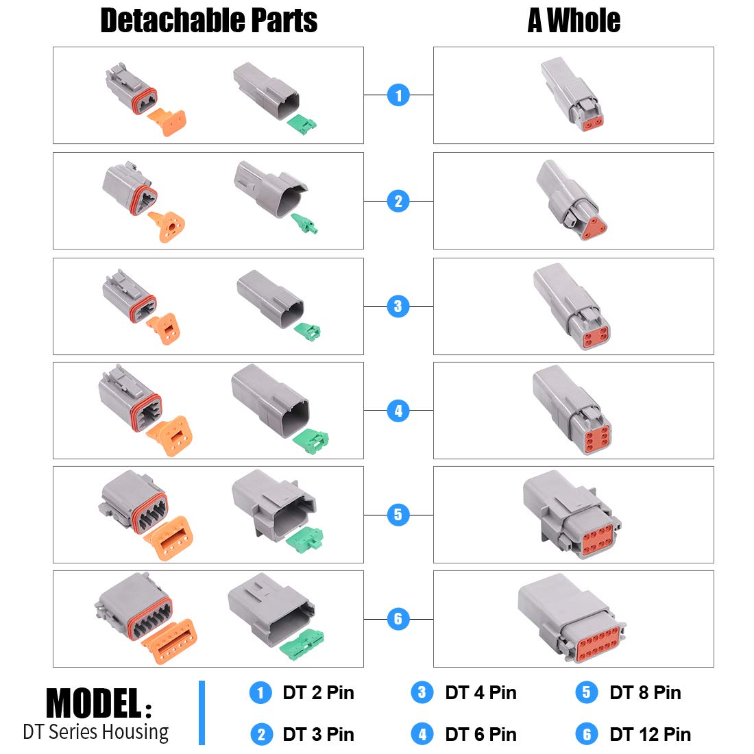 Glarks 6 Sets 2 3 4 6 8 12 Pin Sealed Gray Male and Female Auto Waterproof Electrical Wire Connector Plug Specification: Product Type: Waterproof wire electrical connector plug Pin Number: 2 3 4 6 8 12 pin Color: Gray Wire Gauge: 22-16 AWG Current Rating: 13 Amps Operating Temperature: 14F (-10C) to +176F (80C) Product Feature: ? High quality environmental-friendly nylon materials, wear-resistant for long time use. ? Connector terminals use high-precision phos-copper plating process for high conductivity. ? Buckle design ensures accurate and complete insertion, not easy to slide and fall off. ? DT Series connectors offer reliability and rugged quality. Optional in-line, flange, or PCB mount. ? Suitable for various wire connectors of motorcycle, scooter, car, truck, quad bike, caravan, marine, jet ski, boats. Package Detail: DT04-2P x 1 DT04-2S x 1 DT04-3P x 1 DT04-3S x 1 DT04-4P x 1 DT04-4S x 1 DT04-6P x 1 DT04-6S x 1 DT04-8P x 1 DT04-8S x 1 DT04-12P x 1 DT04-12S x 1 Male Terminal x 35pcs Female Terminal x 35pcs ??Note: ? Please check the specific size according to the second picture. The products are manual measurement and there may be 0.1-0.3mm errors. Please don't mind. ? if you have any questions, please feel free to contact us, we will reply you within 12 hours.