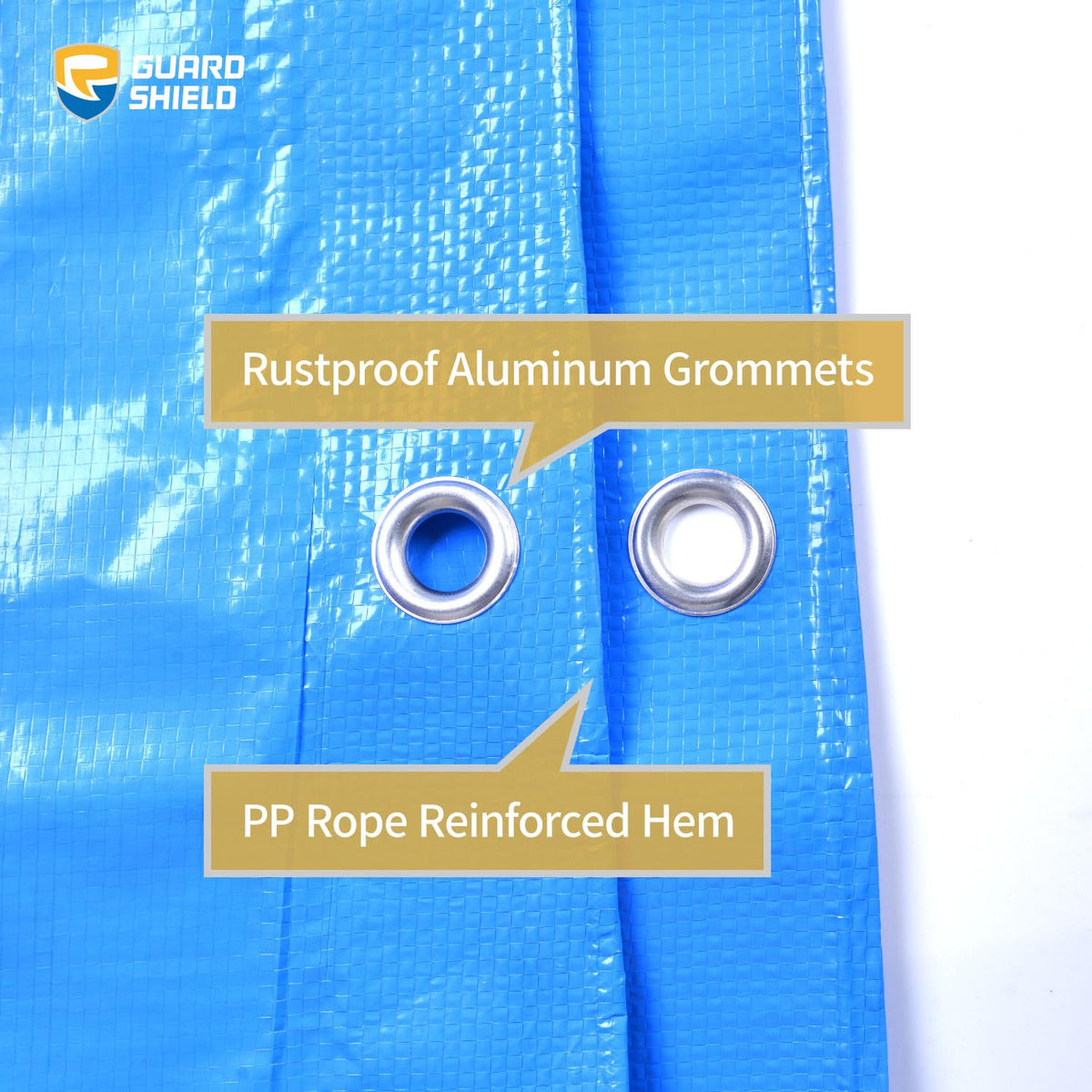 Q: What type of reinforcement does this tarp have for added durability?A: The GUARD SHIELD Blue Tarp features a perimeter rope sewn inside the hem for reinforcement, along with rustproof aluminum grommets every 3 feet to enhance its durability and usability.