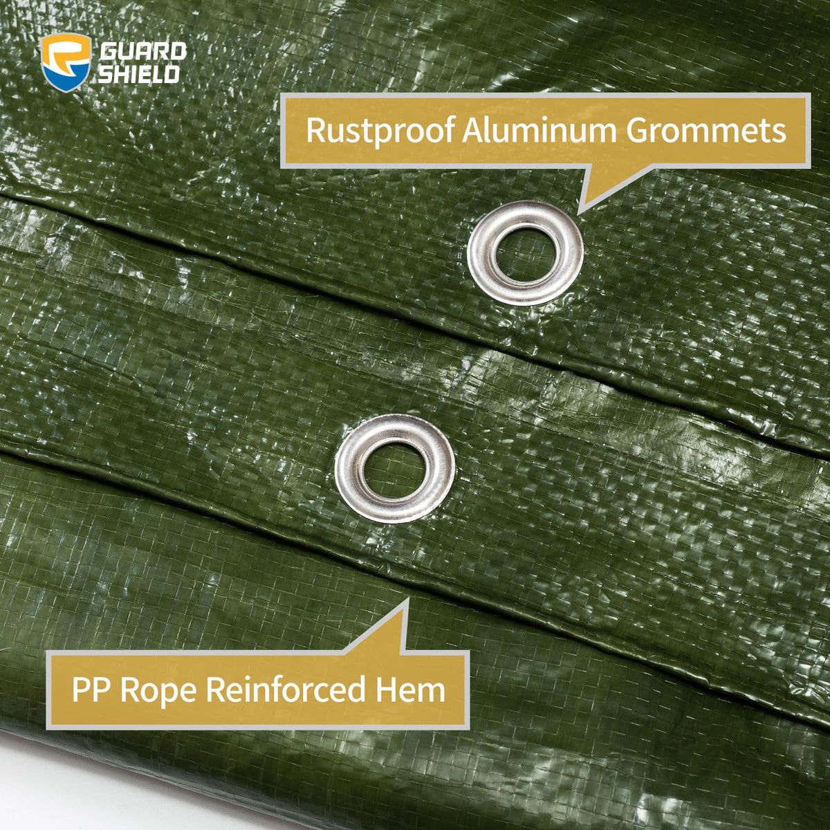 Q: What kind of grommets does the GUARD SHIELD Green Tarp have?A: The tarp features rustproof aluminum grommets placed every 3 feet, which allows for easy securing and anchoring, ensuring your tarp stays in place during windy conditions.
