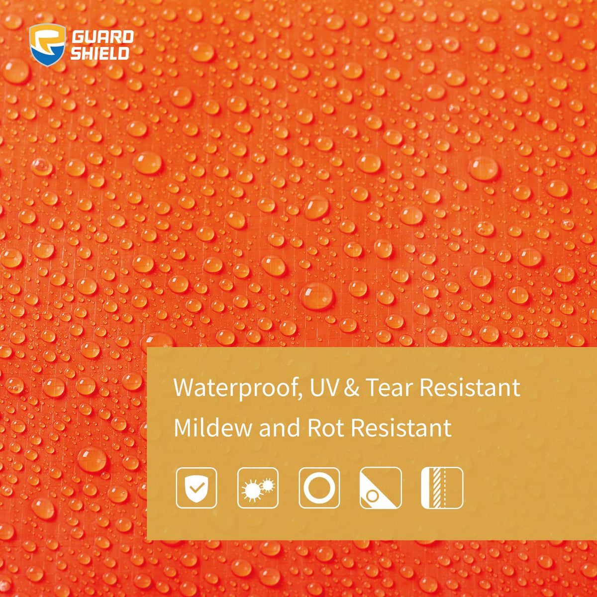 Q: Is the GUARD SHIELD Orange Tarp waterproof?A: Yes, the GUARD SHIELD Orange Tarp is waterproof, making it an excellent choice for outdoor use. Its polyethylene construction ensures that it will effectively repel water and protect the items underneath from rain and moisture.