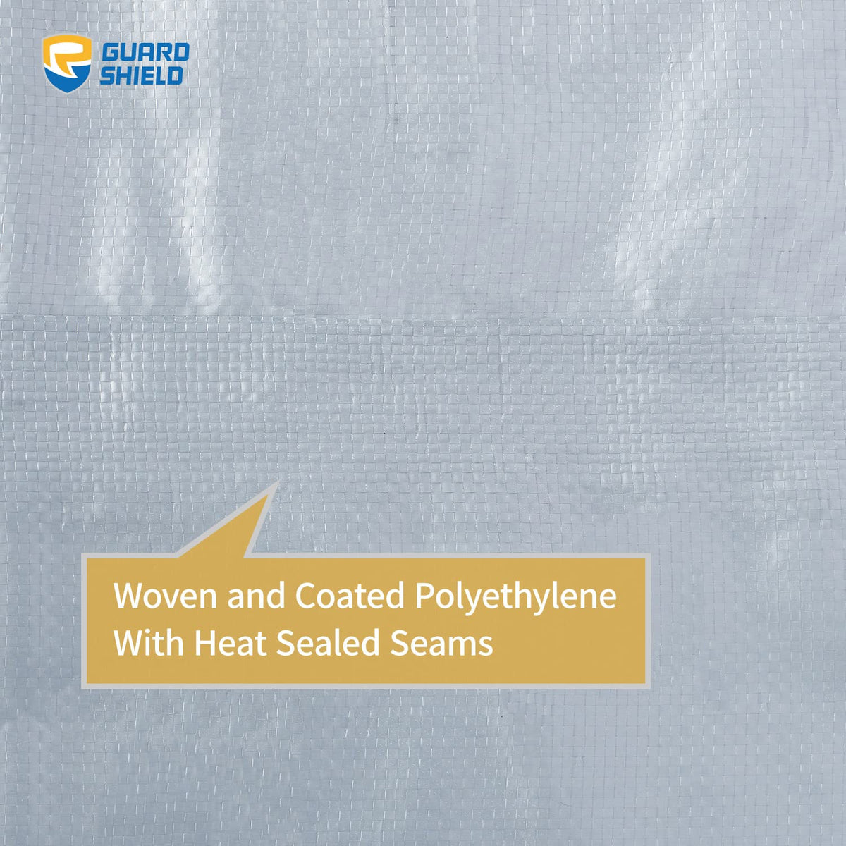 Q: What features enhance the strength and durability of the GUARD SHIELD Silver Tarp?A: The tarp is constructed from woven and coated polyethylene, featuring heat-sealed seams and rustproof aluminum grommets placed every 3 feet for added strength. Additionally, there is a perimeter rope sewn into the hem, which reinforces the edges and helps prevent ripping.