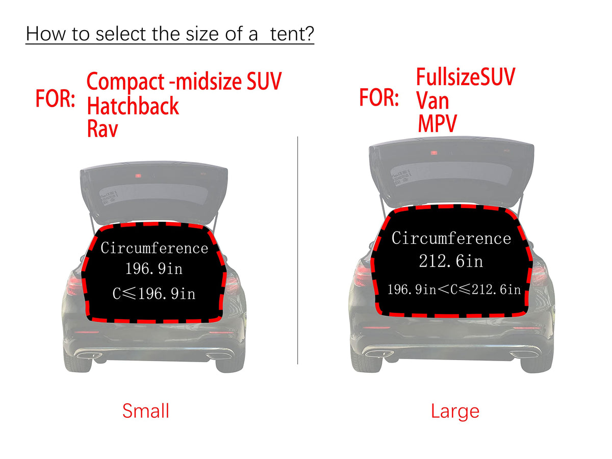 Q: What sizes of SUVs does the Hasika Camping Tent fit?A: The Hasika SUV Camping Tent is designed to fit any SUV size. The small size is suitable for cars, small SUVs, and CUVs, while the large size accommodates midsize to full-size SUVs, CUVs, and mini to midsize vans. Be sure to refer to our measurements for accurate size selection.
