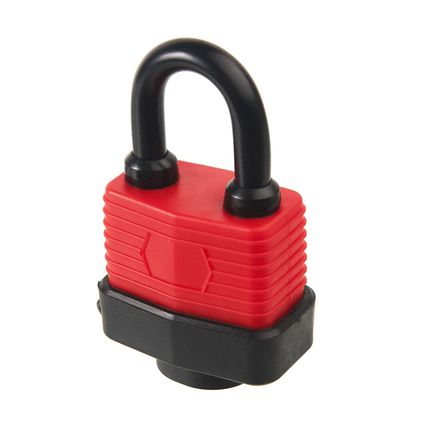 Q: What are the main features of the Heavy Duty Covered Laminated Steel Keyed Padlocks?A: These padlocks feature a black and red plastic covered laminated steel body that provides moisture, dirt, and grime protection, making them ideal for outdoor use. Each lock has a 1-9/16 inch wide body for superior strength and weighs 7 ounces. They are equipped with 4-pin brass cylinders for enhanced security and a hardened steel shackle for extra cut resistance.
