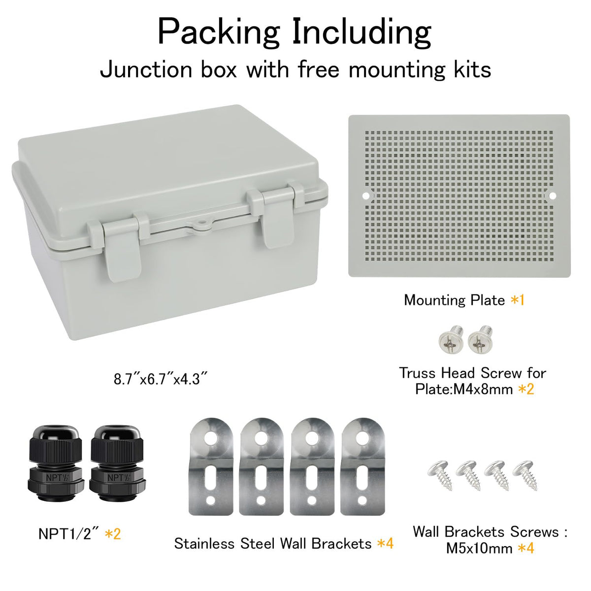 Q: How can I mount the HoHaing Junction Box?A: The junction box features a built-in removable mounting plate and includes four stainless steel mounting brackets, allowing for easy installation on walls or fences. Additionally, it comes with two pieces of 1/2" NPT cable glands for feeding wires outside.