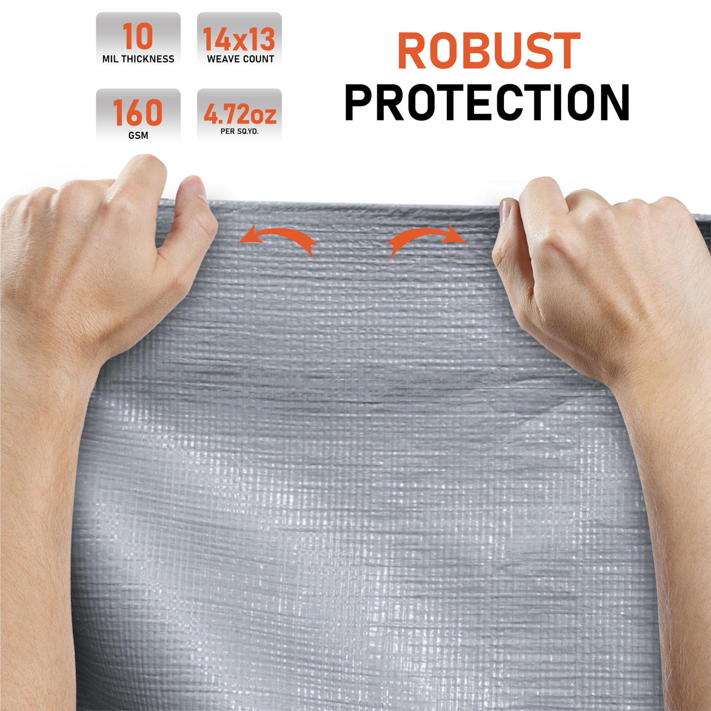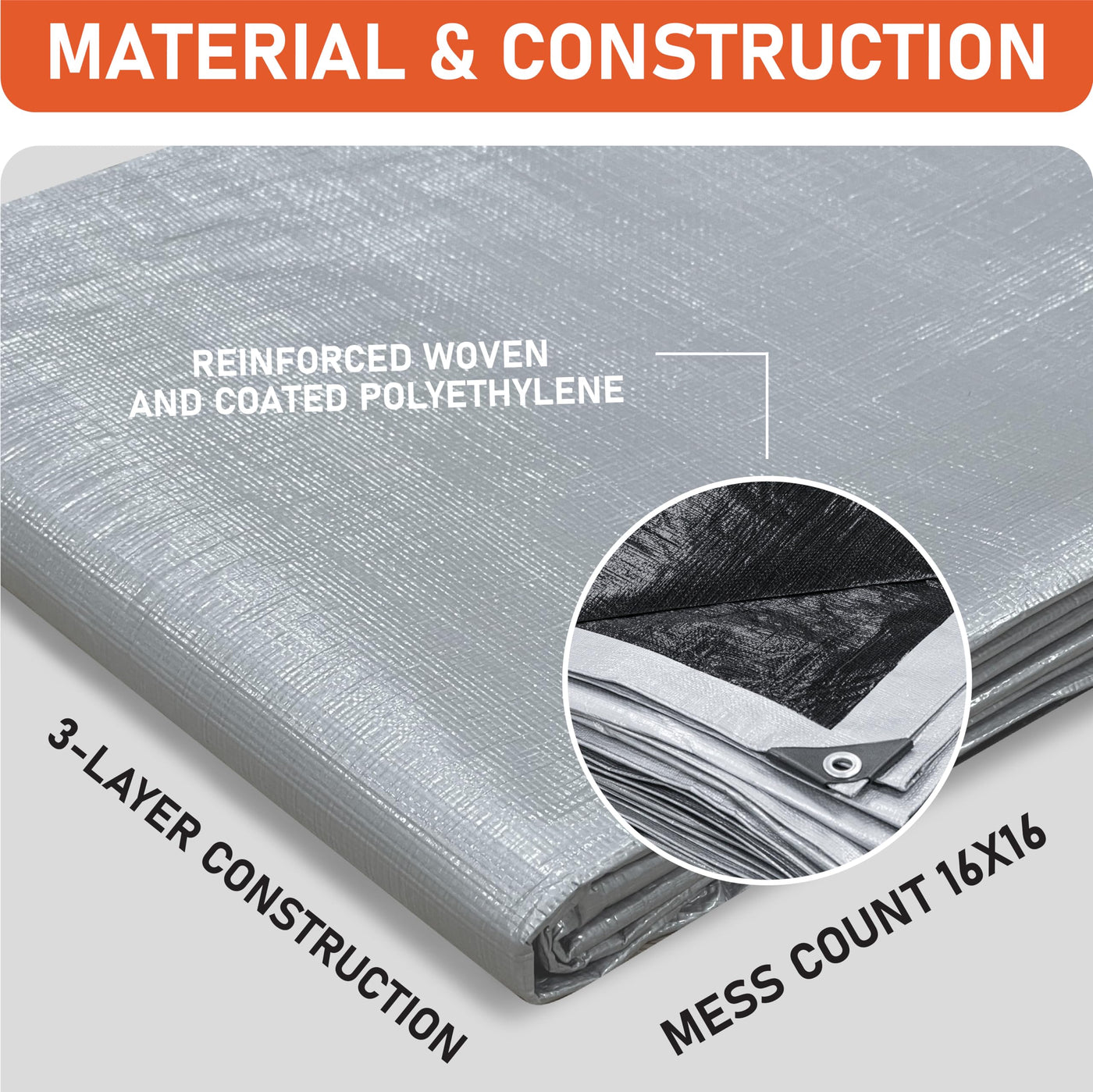Dual-Layer Protection: Double-laminated coating for maximum durability. | Strong & Resilient Weave: 160 GSM, 10 mil thickness, with extra-strength weave for longevity. | Enhanced Edge Reinforcement: Reinforced hem with PP rope, plastic corners, and rustproof aluminum grommets every 3 feet. | Heat & UV Resistance: Black side for heat absorption and silver side for UV ray reflection. | Versatile & Efficient: Ideal for construction, agriculture, boating, camping, and more. Available in black and silver colors.