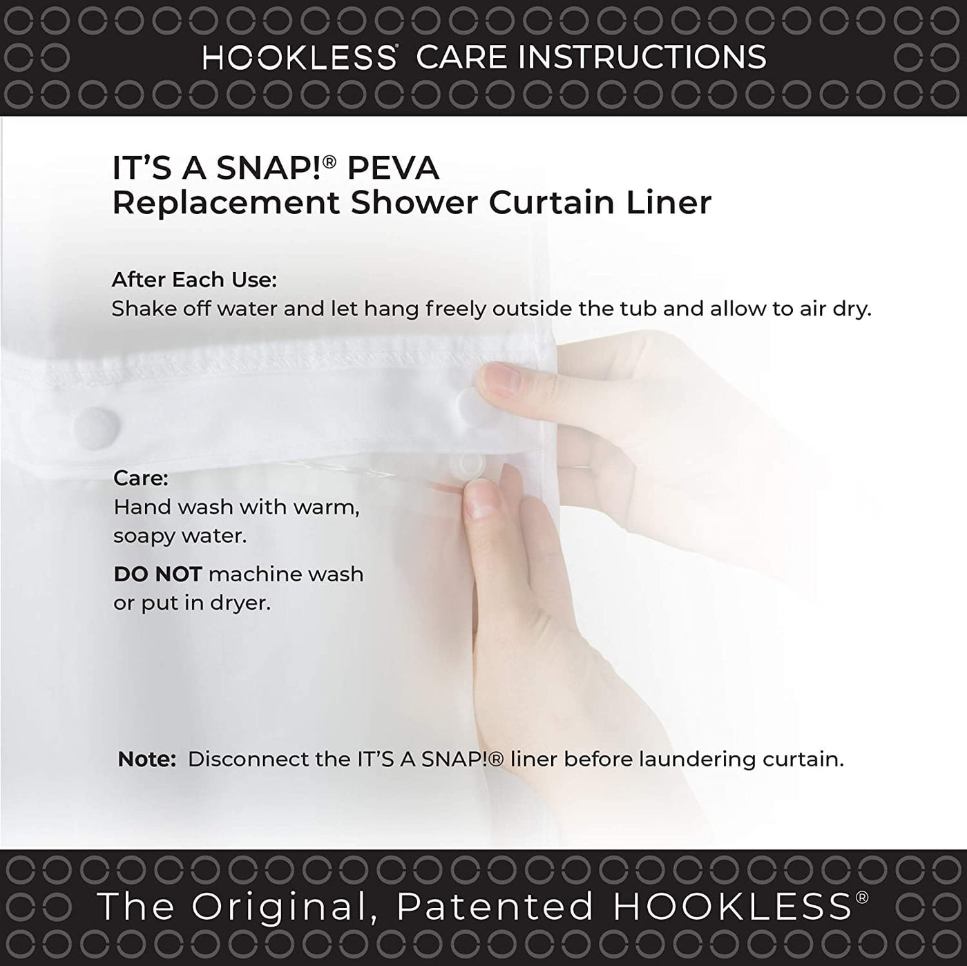 Extend the life of your Hookless shower curtain by adding our It’s A Snap! PEVA liner. Our liner is easy to replace and snaps on and off so you can change it in seconds. The hem is specially sewn to promote water repellency and more efficient water run-off, ultimately reducing the ability for mildew to form. Magnetic bottom helps hold shower curtain liner in place and keeps water from splashing out.