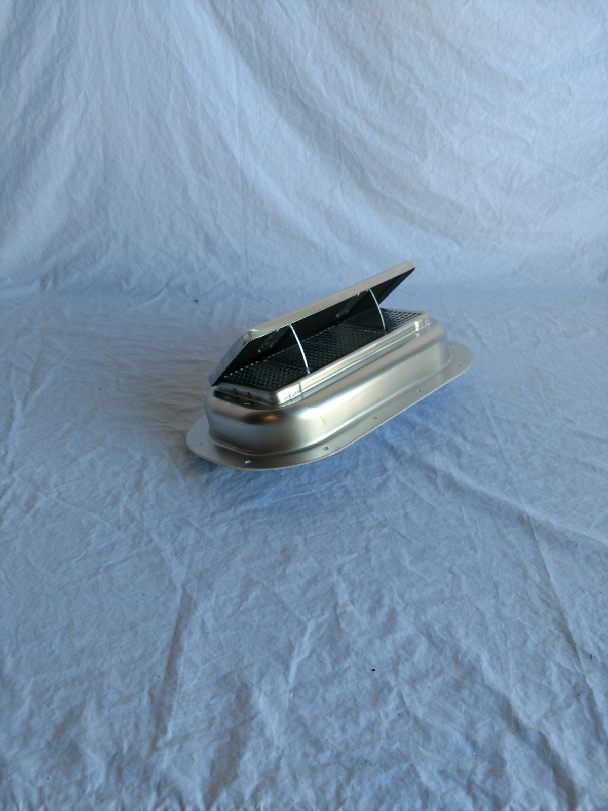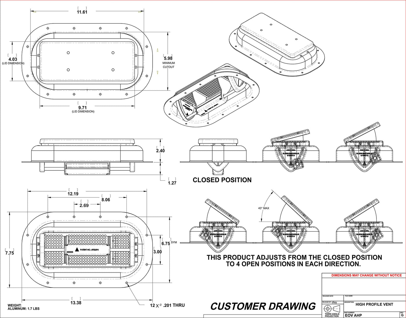 Aluminum Pop-Up Vent 13.375 L X 7.75'' W X 2.40'' H ( Flange To Cover Closed) Overall Size. Bi-Directional, Forward Or Reverse Top Opening. Mounting Flange Has A Perimeter Of Holes For Fastening, (12) 3/16'' Diameter. Top Lid Securely Clamps Down To Prevent Water Entry, Gasket-Ed Lid. Cutout Opening 5 5/8'' X 11 1/4'', Inside Corners Require A 2.25'' Radius. Designed To Place On A Flat Roof. Includes (2) 1/8'' Thick Neoprene Gasket. There Are Two Plastic Support Ends That Are Part Of The Mechanism That Allows Lid To Pivot.