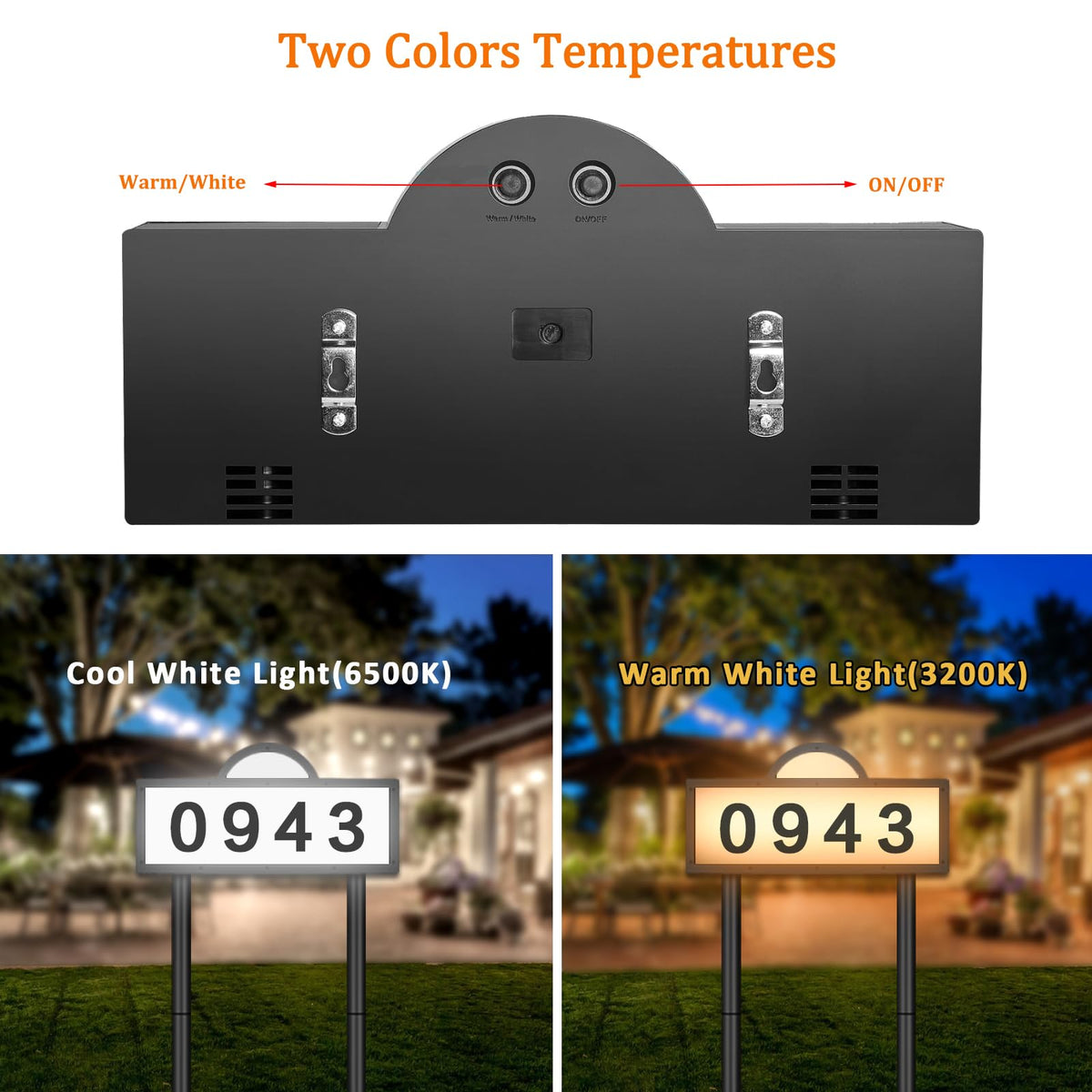 Q: What are the lighting modes available for the solar address sign?A: The solar address sign features two lighting modes: a warm white light at 3200K and a cool white light at 6500K. You can easily switch between these modes using the 'WARM/WHITE' button.