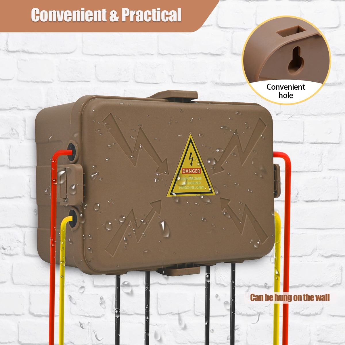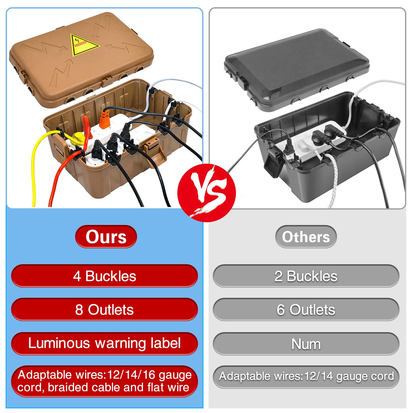 Q: How many cables can the electrical box accommodate?A: The electrical box features 8 cable ports, allowing you to effectively manage multiple outdoor power connections.