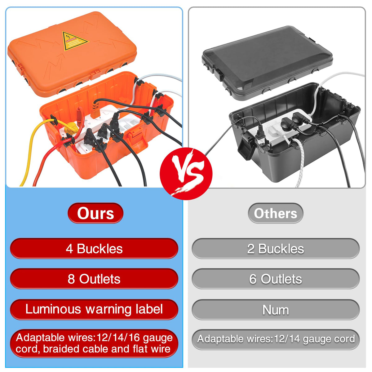 Q: How many cable ports does the box have?A: The box features 8 cable ports, allowing you to securely manage and protect multiple outdoor power cords, timers, and plugs.